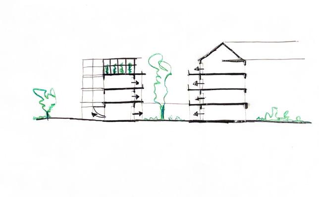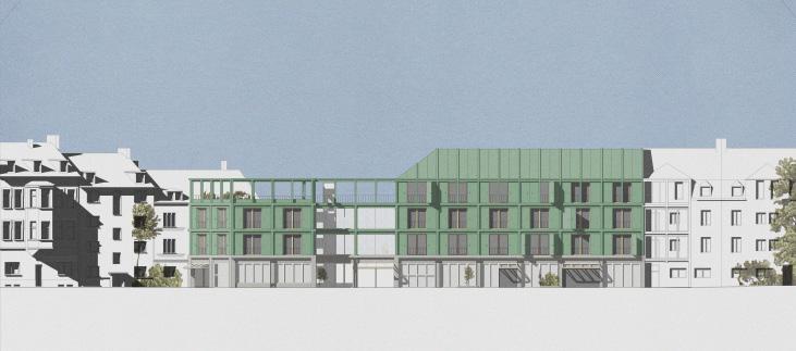 Bei der Nachverdichtung Holster und Frohenhausen steht die Fuge im Mittelpunkt. Der Kern des Projekts liegt im Common Ground, der Gemeinschaft und der multifunktionalen Nutzung des Gebäudes. Der Hof soll nicht trennen, sondern durch eine Lücke verbinden, die als Treffpunkt für die Nachbarschaft dient.