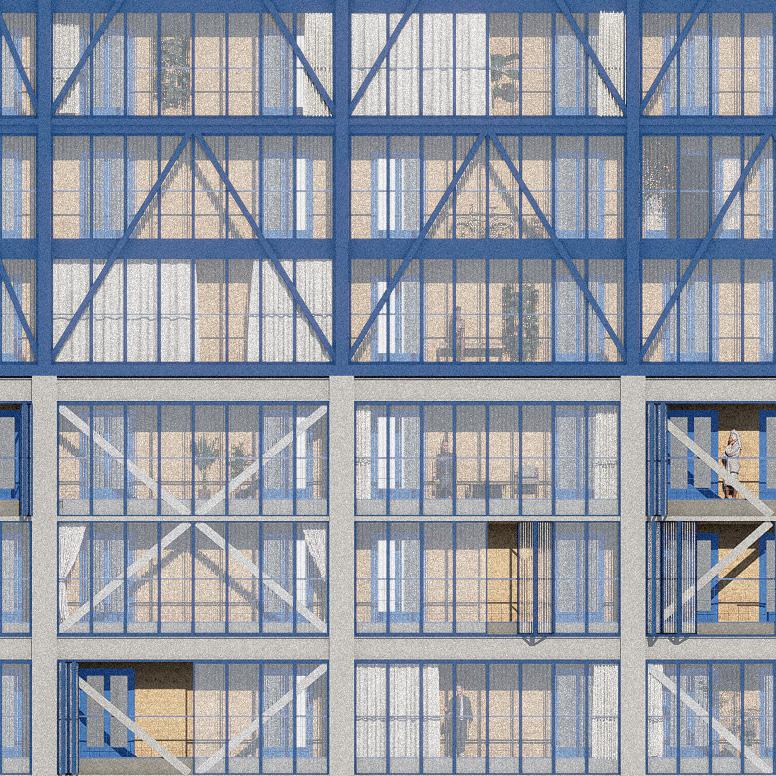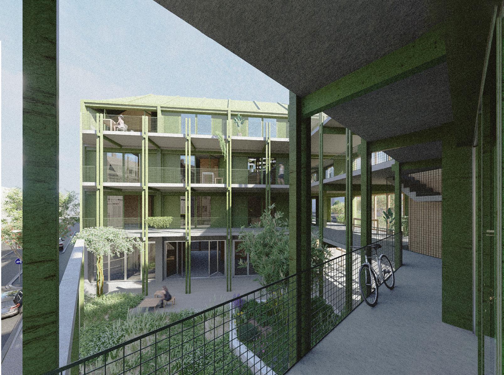 Das Gebäude umfasst verschiedene Nutzungseinheiten wie Bibliotheken, Waschräume, Gruppenarbeitsräume und eine Kita. Diese Räume sind flexibel und erweiterbar, um sich an die Bedürfnisse der Bewohner anzupassen. Die Fassade besteht aus Modulen, die sich je nach Bedarf öffnen oder schließen lassen, um auf Umgebungsbedingungen wie Sonne oder Lärm zu reagieren. In den oberen Geschossen wird sozial durchmischt gewohnt, wobei die Räume so gestaltet sind, dass sie sich an die individuellen Bedürfnisse und Anlässe der Bewohner anpassen lassen. Diese Multifunktionalität und Anpassungsfähigkeit fördern eine lebendige und selbstbestimmte Gemeinschaft.
