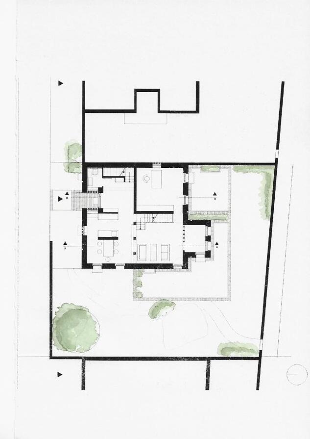 In einer Reihe von Professor*innenhäusern nimmt dieses Haus eine besondere Position ein. Es ist für zwei eng befreundete Professor*innen konzipiert, die Leben und Arbeit miteinander verzahnen, ohne auf individuelle Rückzugsräume zu verzichten. Bereits der Baukörper formuliert diese Haltung: Die klare Trennung der Nutzungseinheiten ist in der Fassade ablesbar und schafft eine Ordnung, in der Differenz produktiv wird. Zwischen Offenheit und Distanz entstehen räumliche Ebenen, die Kommunikation ermöglichen und zugleich Rückzug zulassen. Das Haus sucht dabei keine formale Geste, sondern eine räumliche Balance zwischen Nähe und Privatheit.