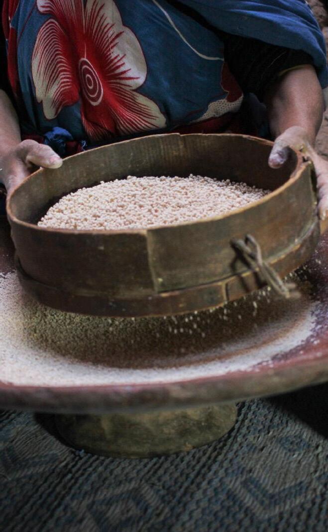 Finally, the semolina is steamed inside a palm leaf basket placed on top of a pot in which the ingredients cook on a fire within a mud hearth.
