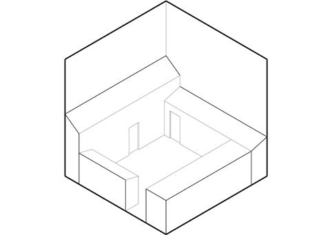 During the interlocking of the blocks, the outer surface of one inclined block enters the interior of the other, and the space enclosed by the intersection of the two inclined surfaces is suitable for a stepped space that can be used for lecturing, scrutinising, and lounging.