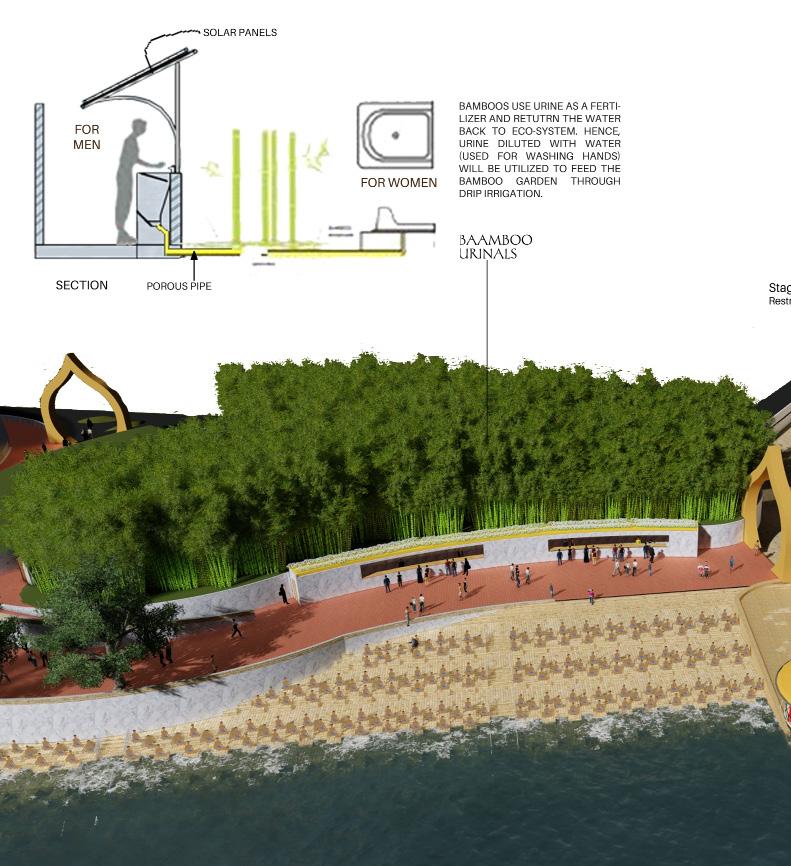 Bamboos can use human urine as a fertilizer, so the urinals are designed such that water used for washing hands would dilute the urine which will then be used to feed bamboos via drip irrigation. Since bamboos grow quickly, they would be further used to make dustbins or Yoga mats. These urinals will be another experience to highlight the fact that water flows in and out of us, reminding people we are part of a larger water cycle. Respectfully returning the water in body to water cycle (ecosystem).