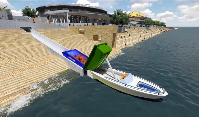 Waste will be collected with a floating boom connected to the other end, which will be removed with the help of a conveyor belt rotated by the water wheel. (Capable of removing over 25,000 kg waste/day) Hinged support is provided for the wheel to move up and down with rising and falling of the water level.