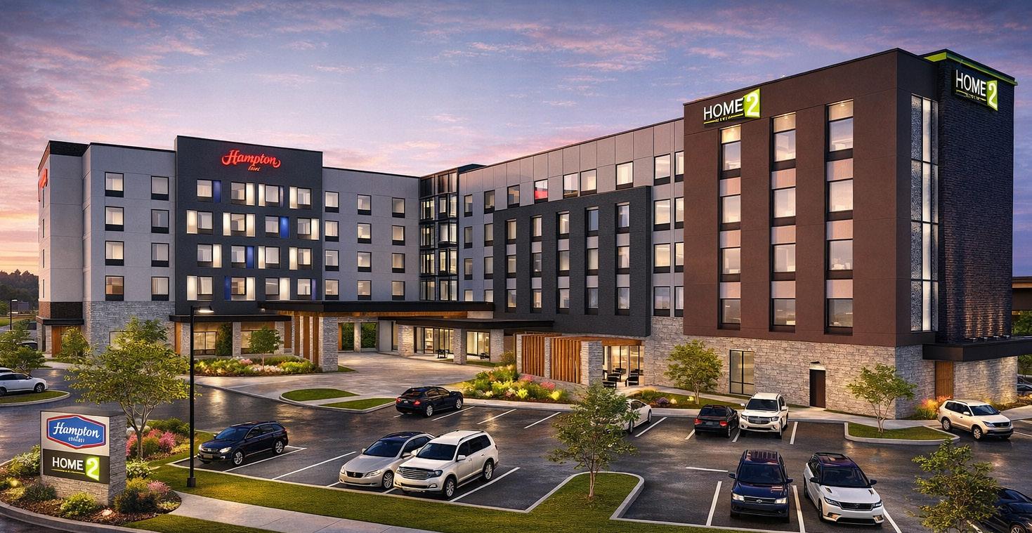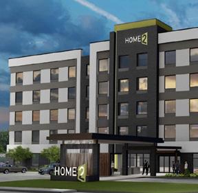 This 160-room dual-brand hotel integrates Hilton Hampton Inn and Hilton Home2 Suites under a single roof, utilizing Type IIA construction. The design features a straightforward L-shaped layout, efficiently separating the two brands: Hampton Inn, catering to business and leisure travelers, occupies one wing, while Home2 Suites, designed for long-term guests seeking a residential ambiance, occupies the other. These distinct zones converge at a central circulation hub. The first level houses backof-house operations and thoughtfully designed shared spaces, fostering seamless functionality and interaction between the two brands.