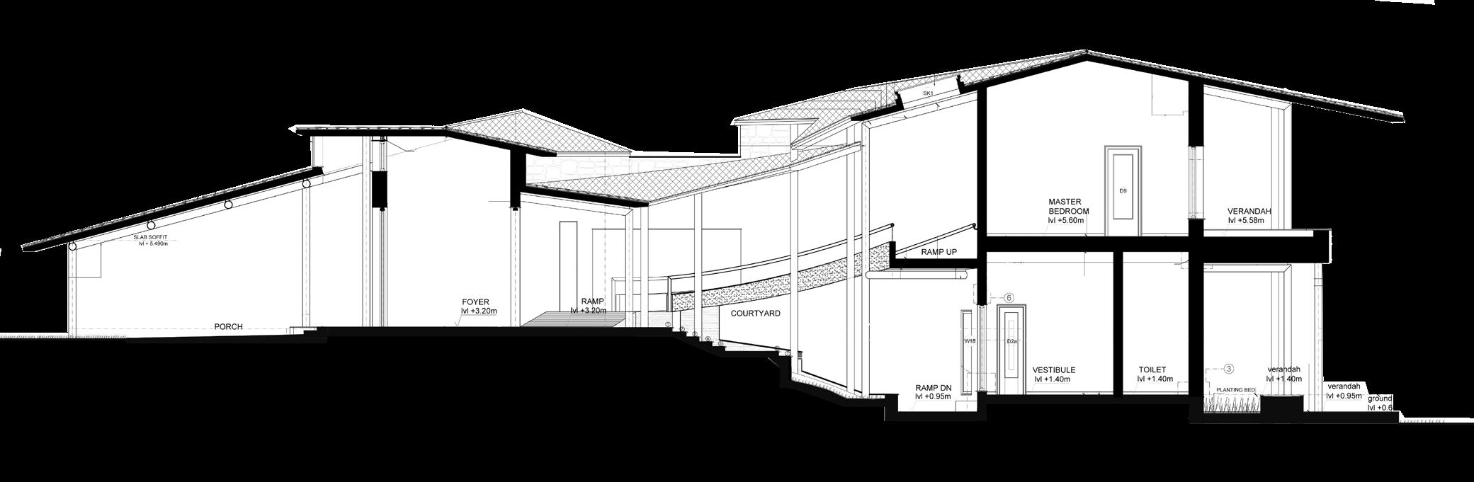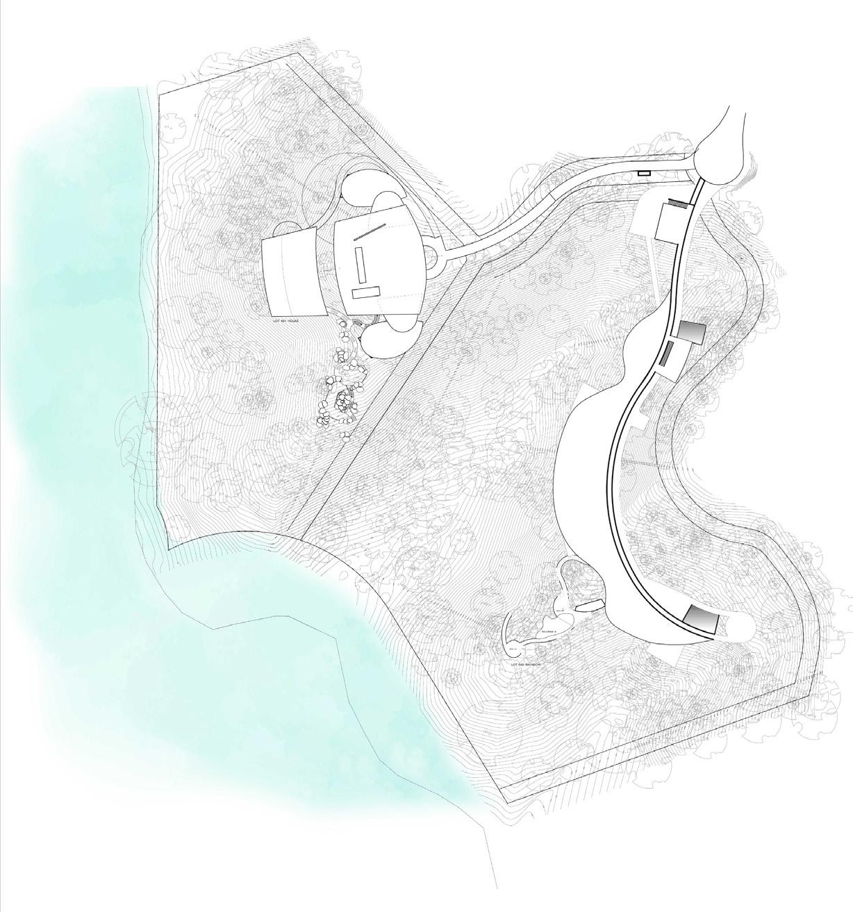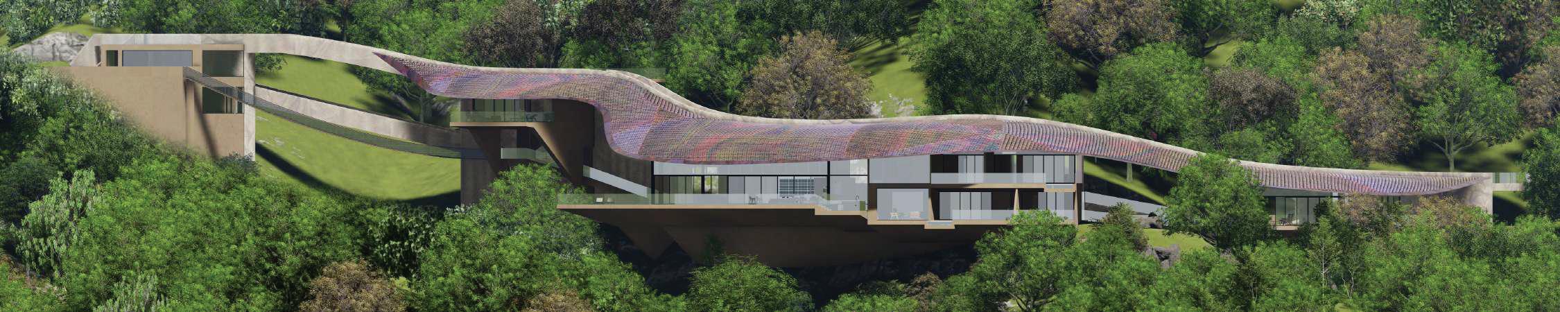 This 13-bedroom house adapts to the topography like a snake, with a retaining wall housing all services and a car t ramp on top.