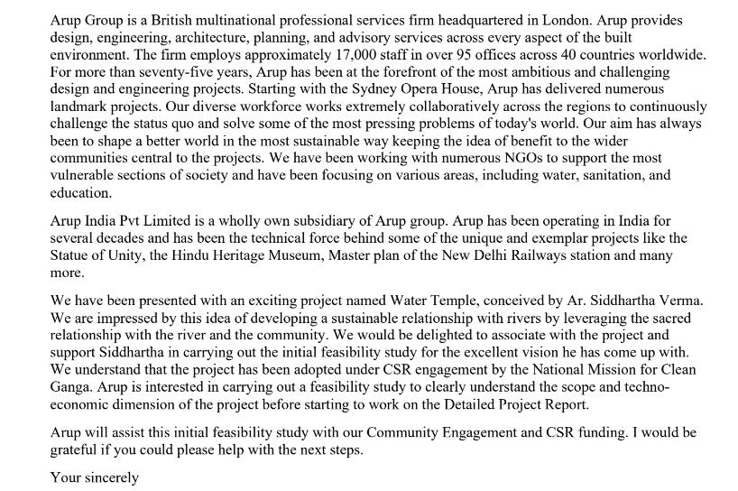 We have been presented with an exciting project named Water Temple, conceived by Ar. Siddhartha Verma. We are impressed by this idea of developing a sustainable relationship with rivers by leveraging the sacred relationship with the river and the community. We would be delighted to associate with the project and n carrying out the initial feasibility study for the excellent vision he has come up with. he project has been adopted under CSR engagement by the National Mission for Clean sted in carrying out a feasibility study to clearly understand the scope and technoeconomic dimension of the project before starting to work on the Detailed Project Report