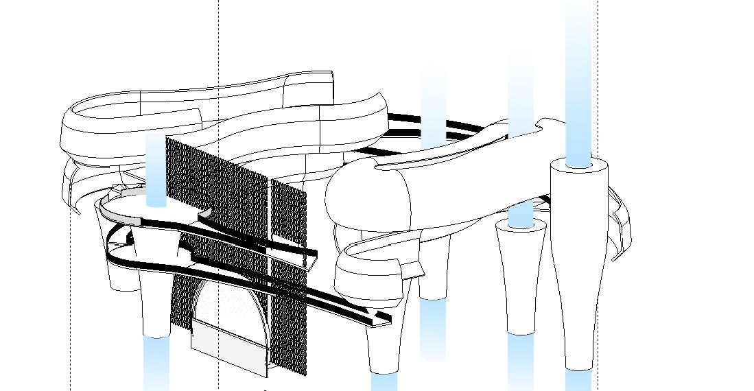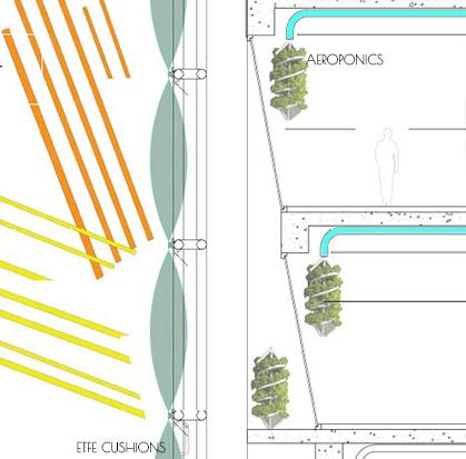 Aeroponics Absorb sunlight, while water evaporating through their leaves lowers nearby air temperatures. Inflatable ETFE controls sunlight creating a micro-climate inside. Water mist system running through the ceiling and dendophile columns would let plants grow downwards from ceilings, out of direct human reach but clearly visible, creating a biophilic environment for students to learn.