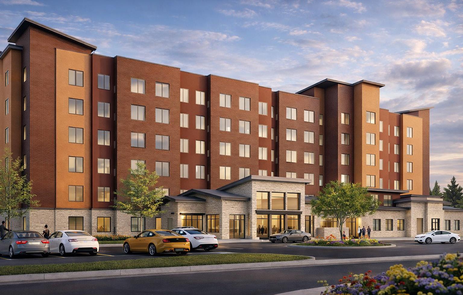 This Type V-A wood-frame Marriott property balances brand standards, cost efficiency, and clear façade articulation through a combination of brick, EIFS, and metal panel systems. The ground level integrates stone cladding and a defined entry canopy to establish a strong arrival experience aligned with TownePlace Suites brand identity.