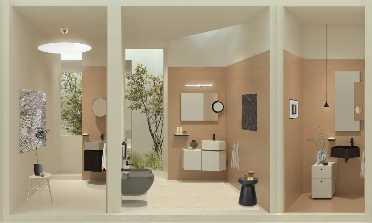 villa a space with a modernist flavour where architectural and chromatic rigour welcomes the new collections; an experience made of neutral tones, essentiality, and rigour with small hints of colour. Kanto, Itaca, Otis and Filo, follow one another in a space that opens up into a multitude of kaleidoscopic settings.