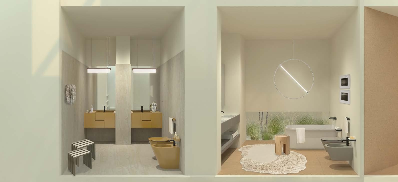 cielo è colore il colore è diventato negli anni sinonimo di Ceramica Cielo, azienda che ha re-interpretato l’arredo bagno con nuovi accenti di colore. Questa stanza è una lente di ingrandimento sul sodalizio tra forme e pigmenti, qui si celebra il “potere autonomo” del colore nel vestire la “sala da bagno”.