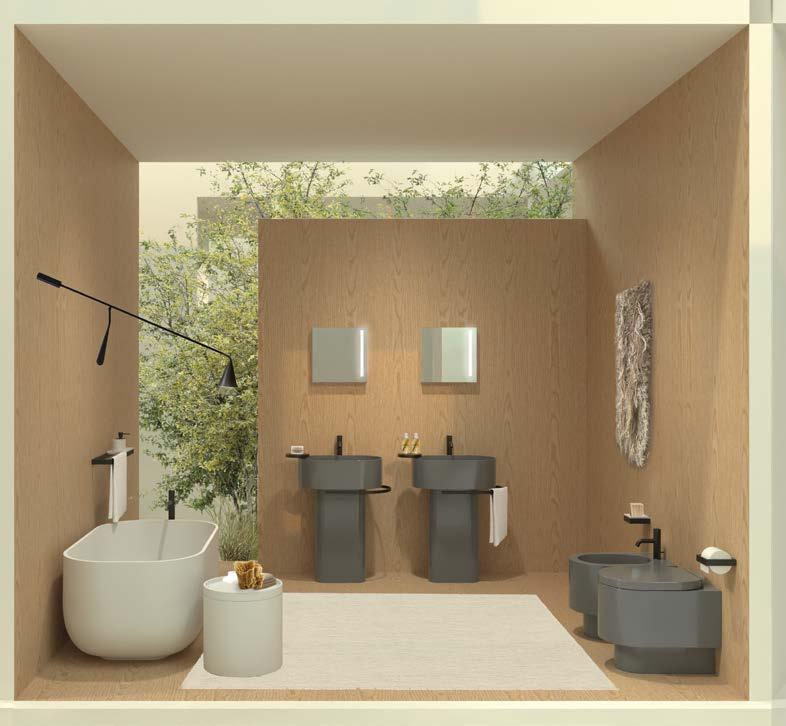 Otis ceramic washbasins with smooth column, Fumo finish. Luc square mirrors. Otis floor-standing WC and bidet in the Fumo finish. Dafne bathtub in the Matt White LivingTec finish.