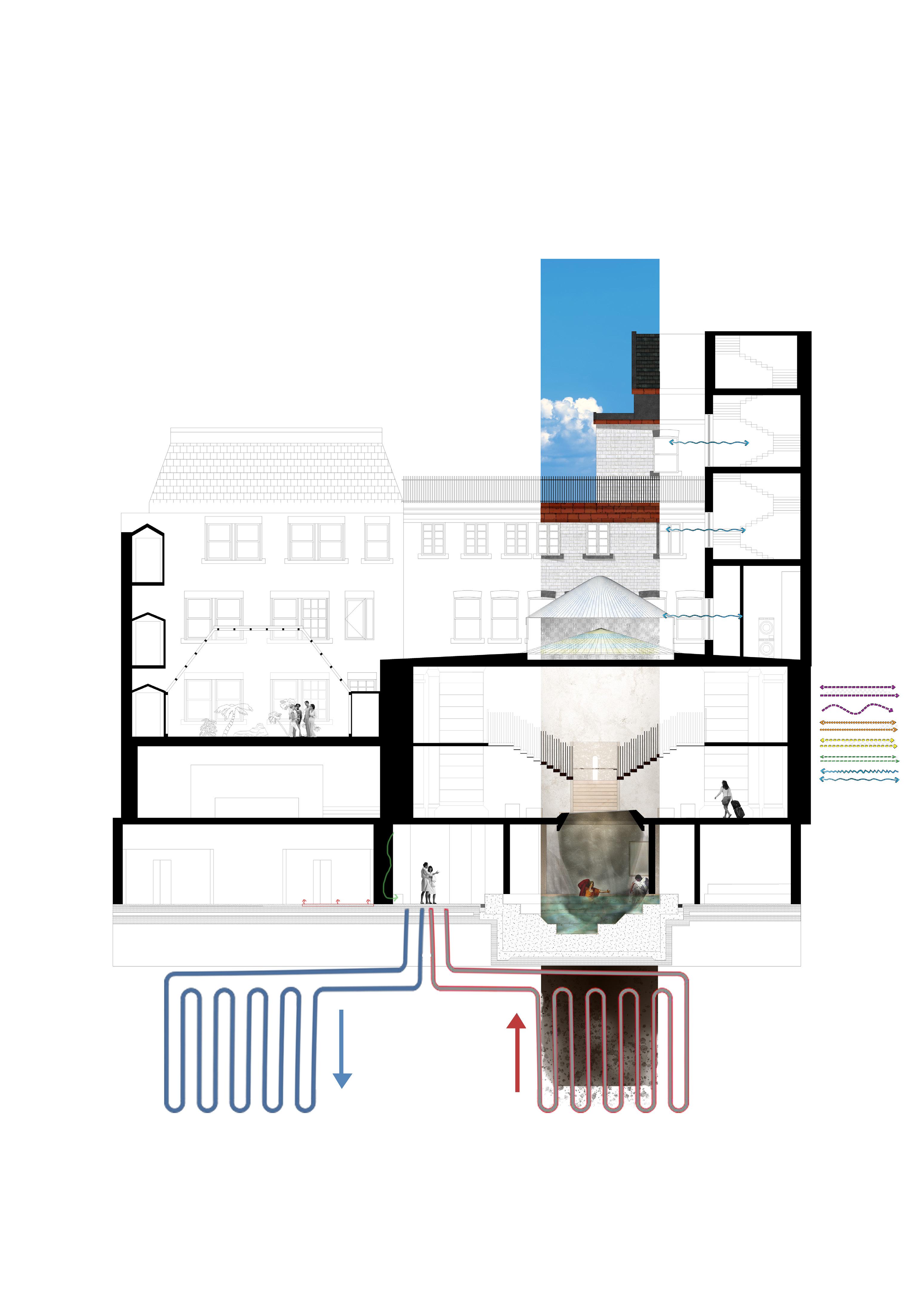 Breaking tradition with a traditional hotel offering, residents will have access to discussion and debating chambers rather than conference facilities, and social spaces which harness the historic potential of Roman Bathhouses to create a communal area for relaxation through spaces such as a tepidarium, a caldarium and a frigidarium.