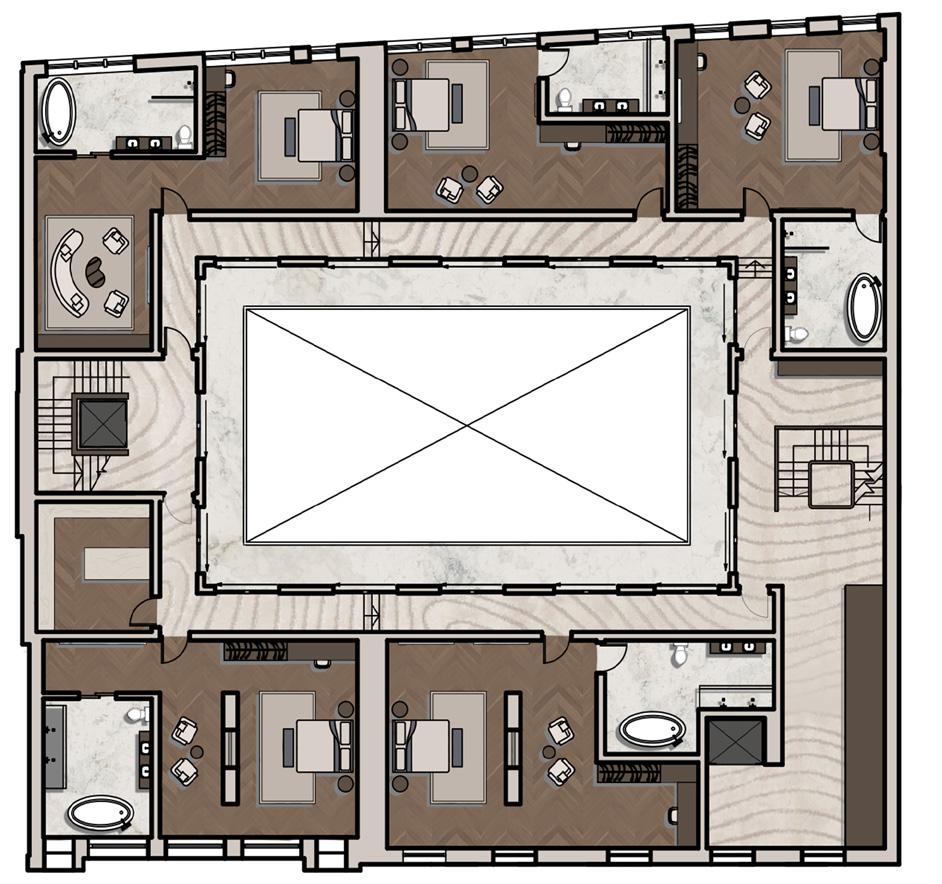 Upon entering the hotel, guests are transported to a different world. The hotel’s central atrium and Bar serves as the heart of the hotel, with grand staircases leading up to balconies that overlook the expansive space. The atrium is filled with lush greenery, providing a natural contrast to the brick walls of the tunnel entrance. The hotel’s basement level features a shopping arcade that is open to both guests and the public. Here, guests can browse through boutique stores and salons, providing them with an immersive experience that is integrated with the local community. The guest rooms are located on the upper levels of the hotel and are designed to be spacious and comfortable, featuring high-end amenities.