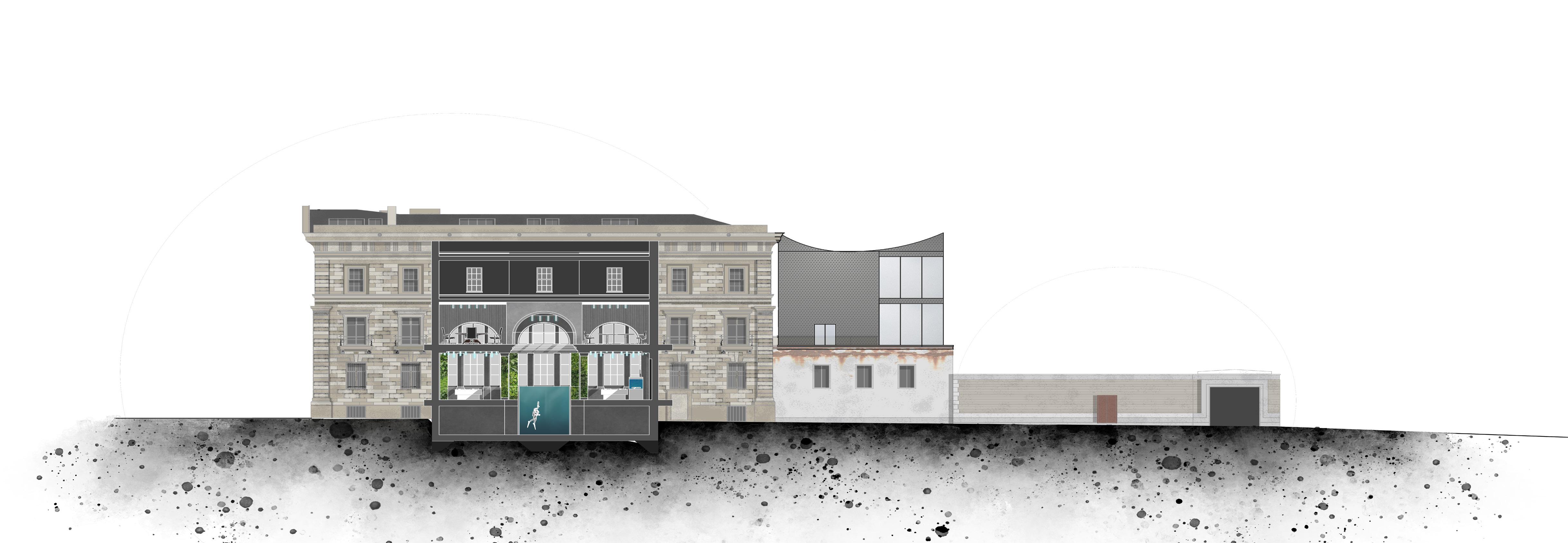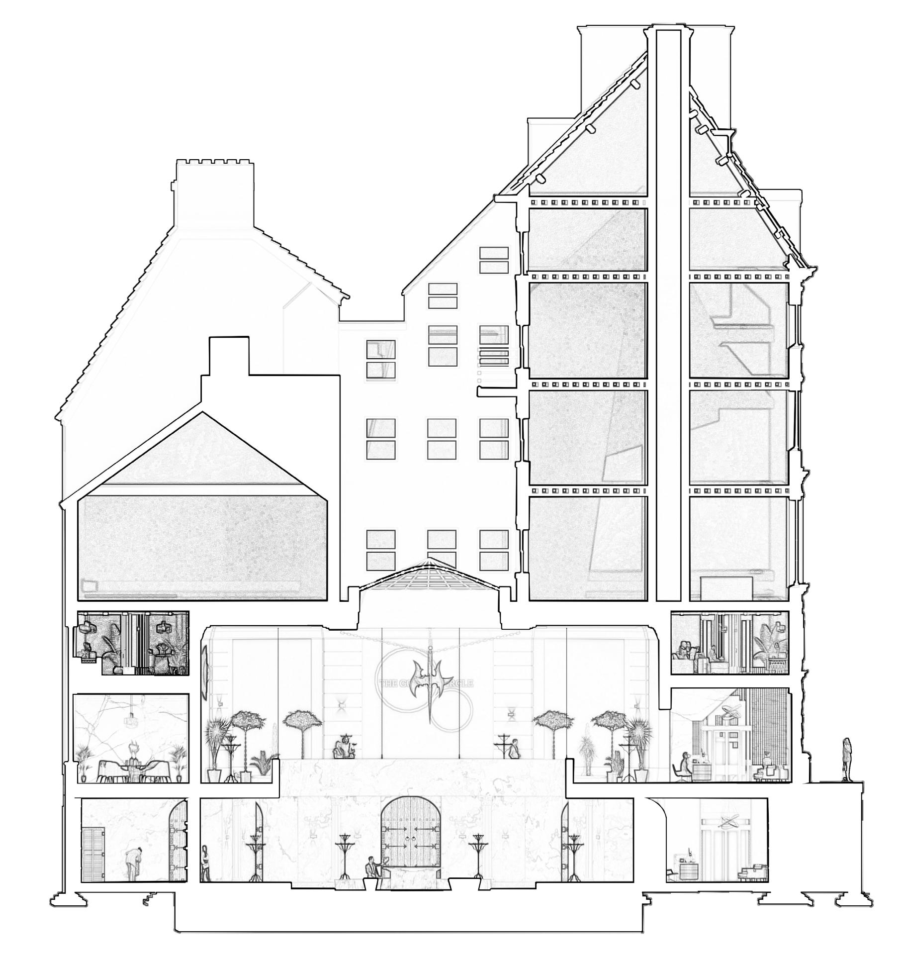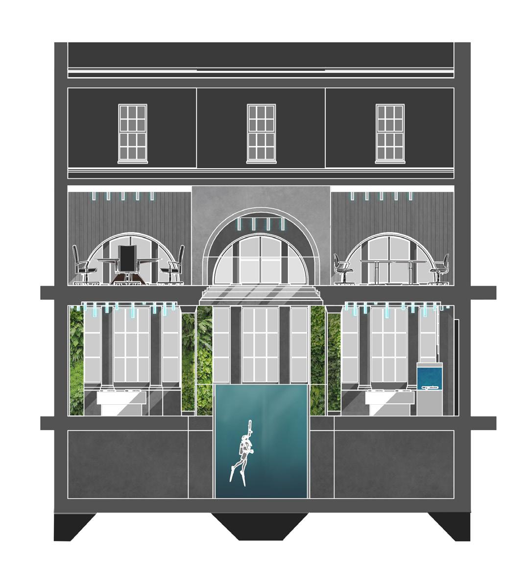 A hidden retreat, tailoring towards a exclusive experience for all, allowing the priviledged elite to attain anonymity, this discreet buildings allows for a haven where the rich and famous can seamlessy integrate into everyday life without raising suspicion. Beneath the surface of the National Westminister Building is a tunnel system, which allow access to other facilities and establishments, to allow for quick direct travel without being seen, a press free guaranteed experience with secure and discreet entrances. a centrepiece of this project is the open main space, where whispers of meetings and performances echo, providing a multi-purpose space once for cults, but majority of the time is for evening performaces for the restaurant and bar. Surrounding this obscure space lies premier luxury spa, where luxurious treatments await to rejuvenate both body and spirit.