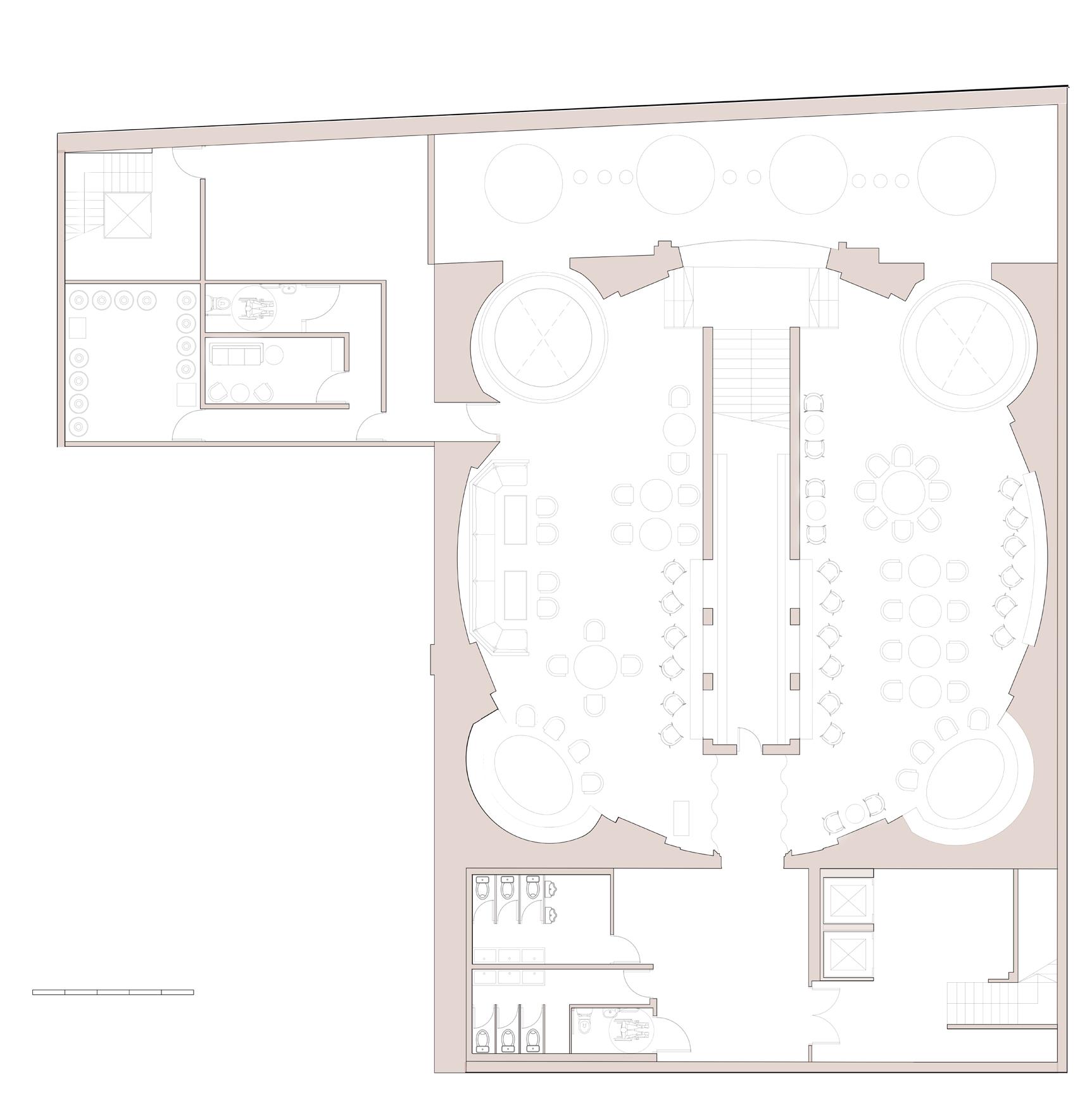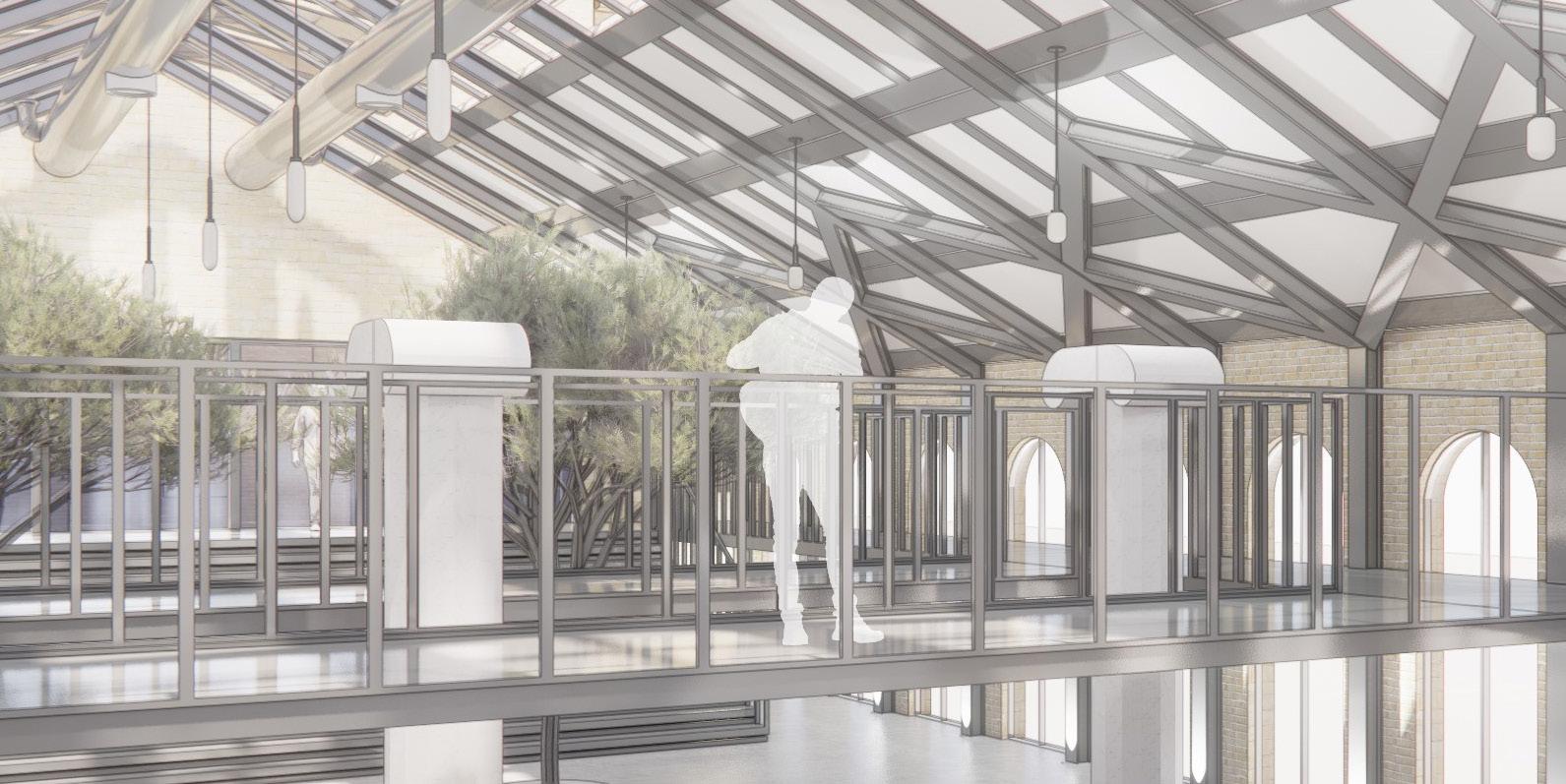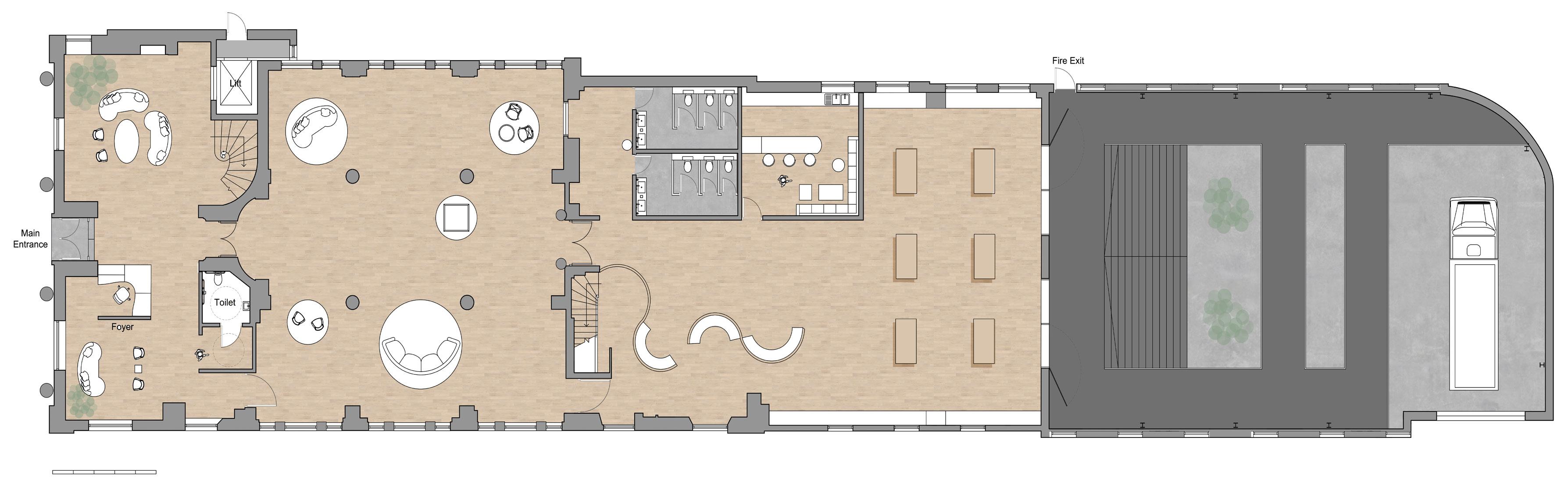 Crafted Revival Studio specialises in refurbishing furniture from historic places, giving them a new story. The Bank of England will be transformed into various spaces - the ground floor features a welcoming reception, a versatile main hall with occasional showroom and two workshops for meticulous and industrial tasks. The back hosts an open workshop with an elevated walkway for craftsmen to work on various projects, both big and small. The space is flexible, ensuring functionality for diverse needs.