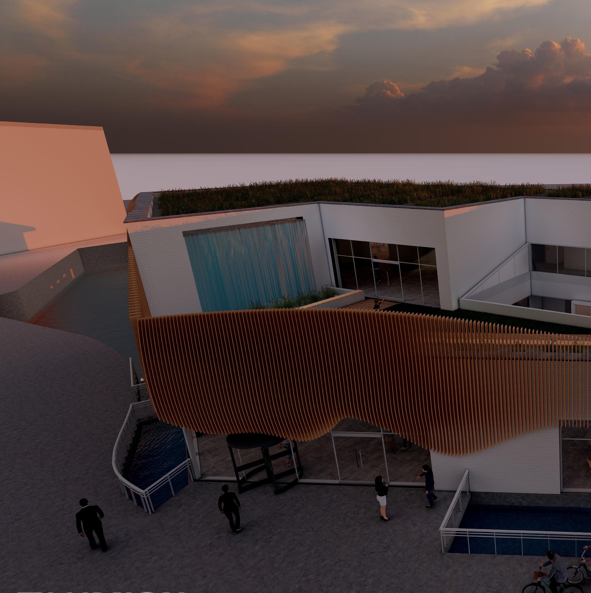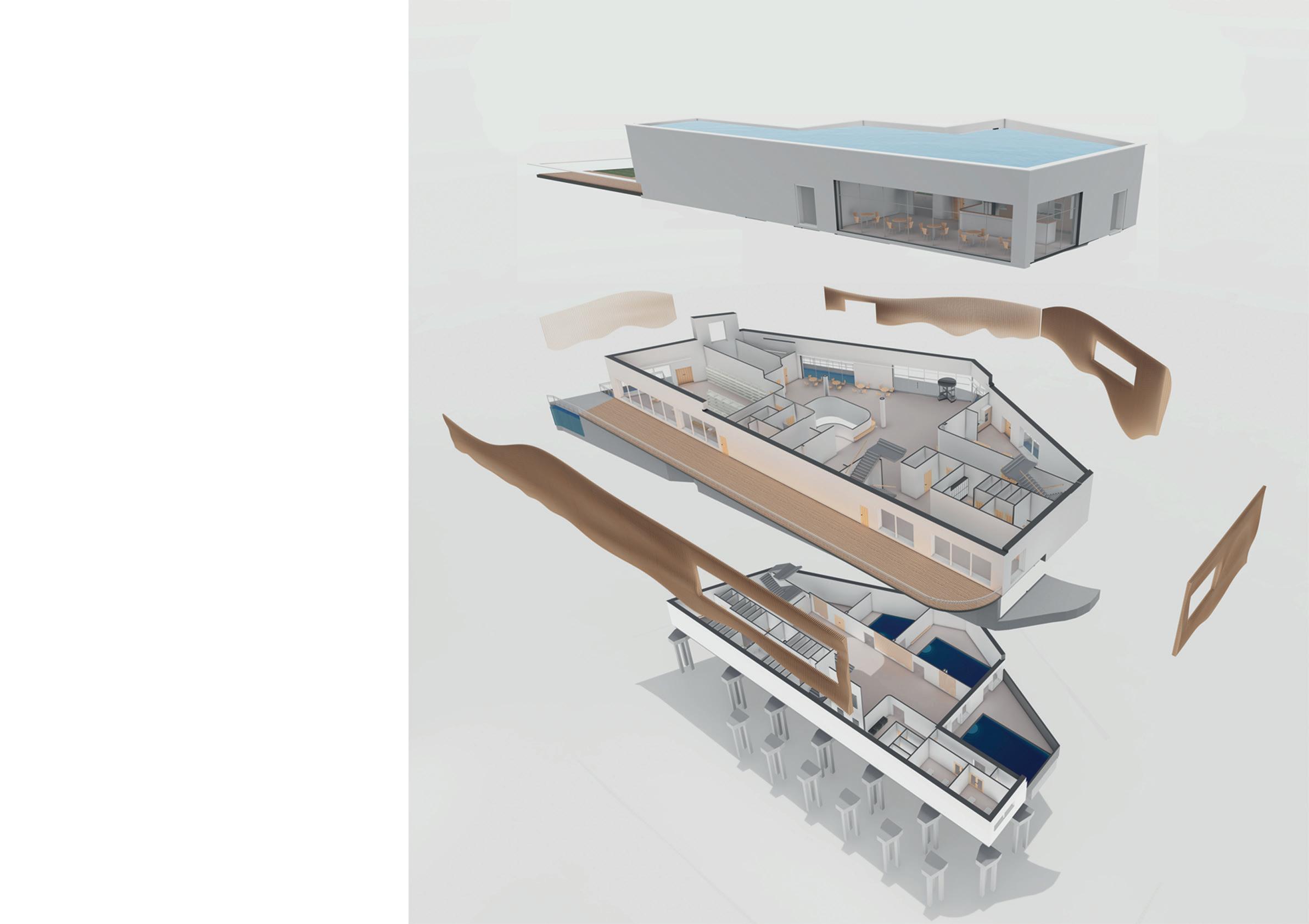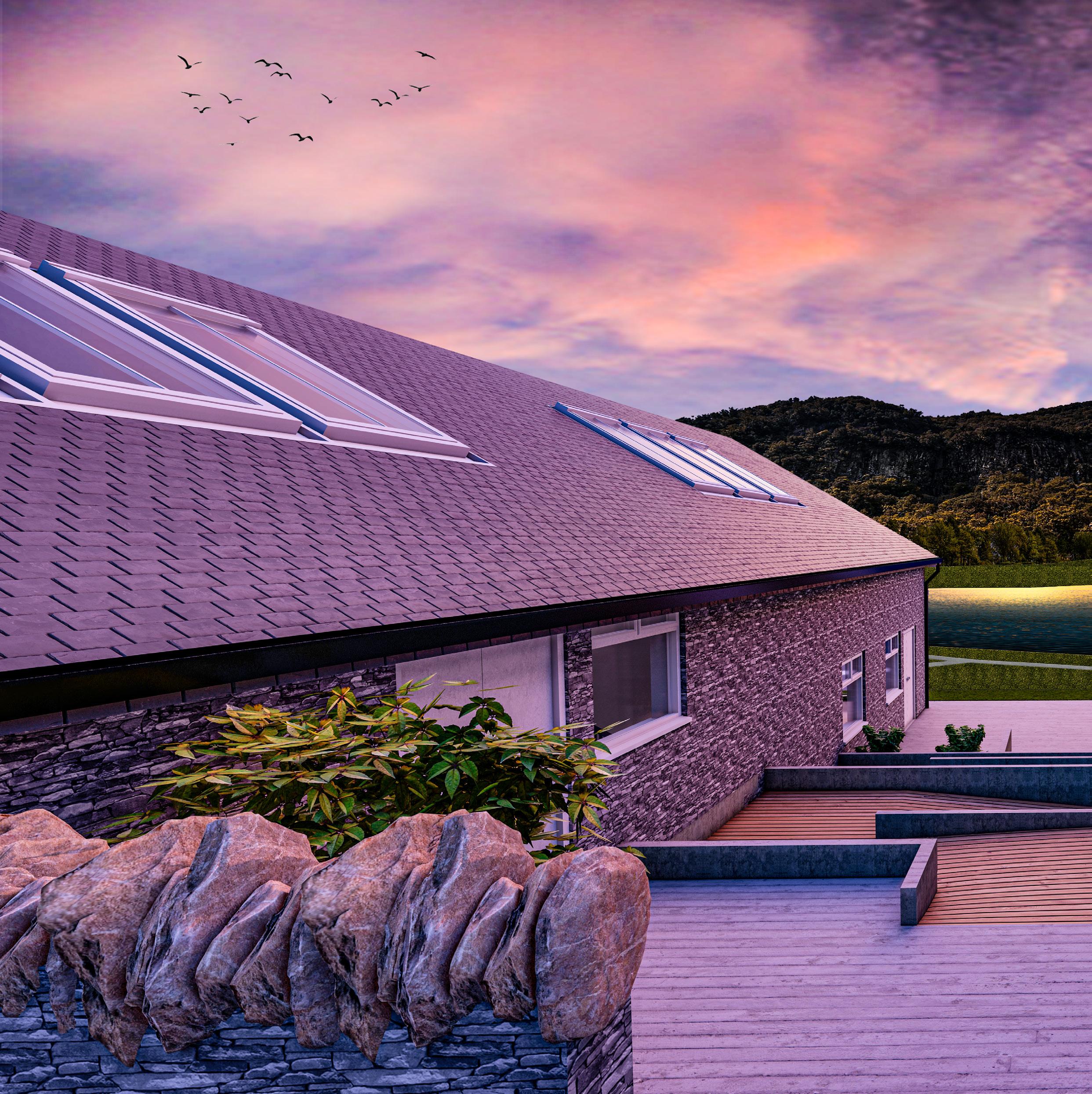 The building is designed to connet people to the traditional bathing techniques of the Romans. The abundant water source next to the building is used to pump the water to the top of the building. Where the waters journey begins down the building and through the reed beds, filtering the water. The filtered water is then used to fill up the three underground pools.