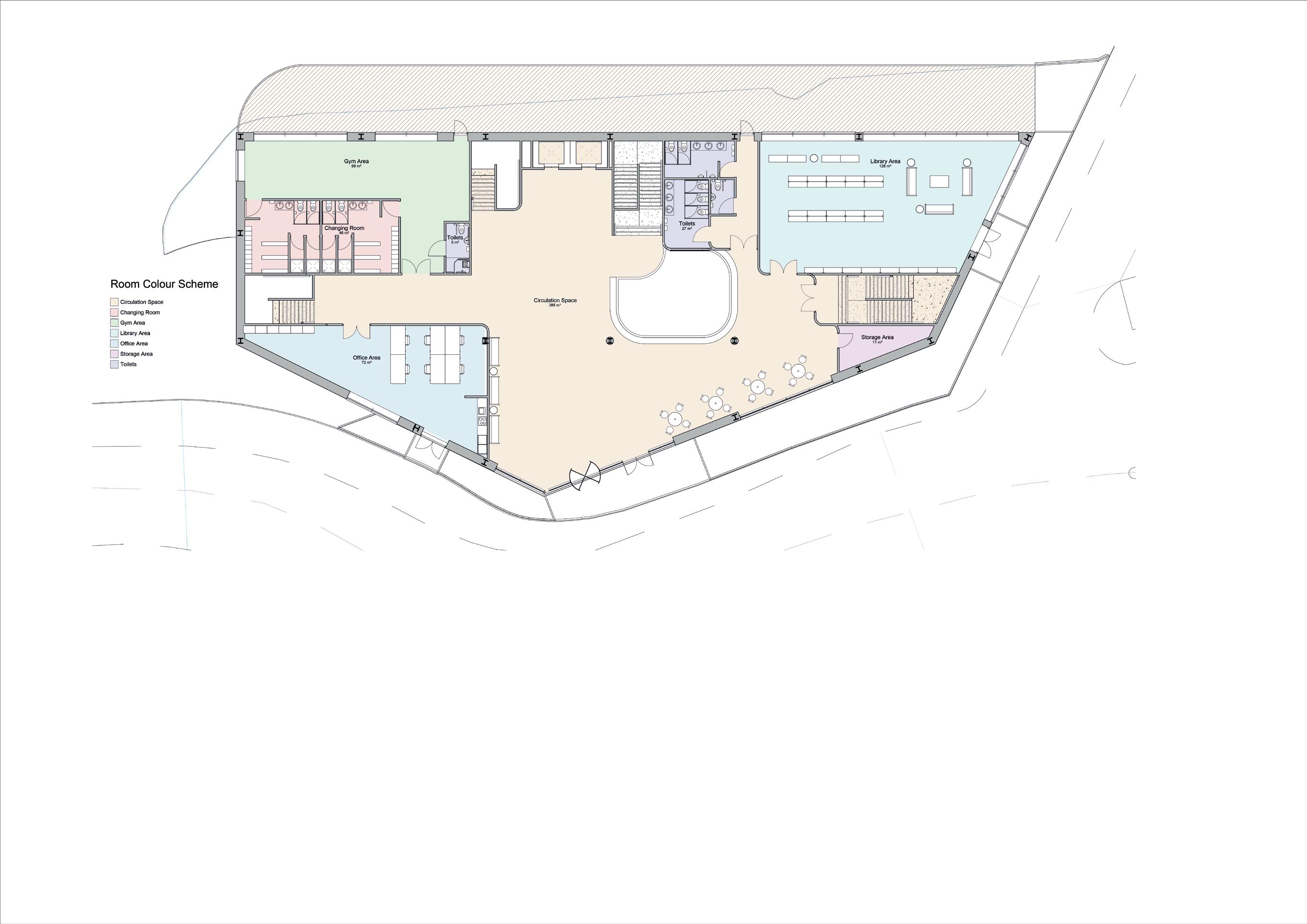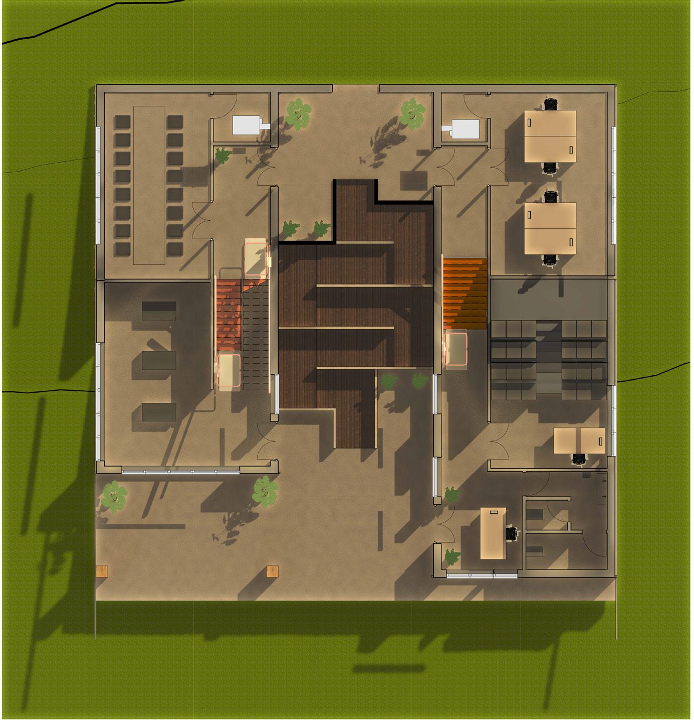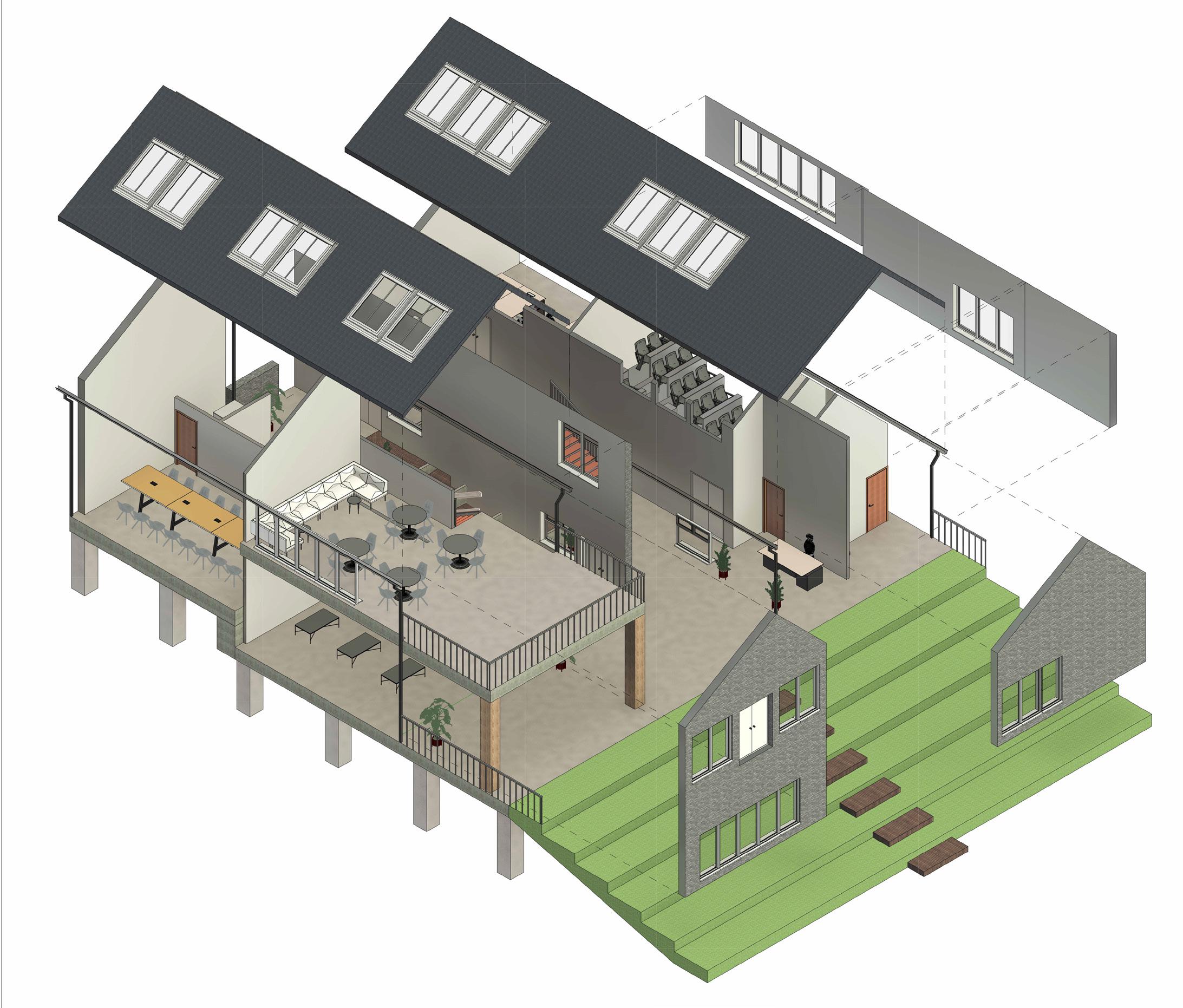 The building is designed to connet people to the traditional bathing techniques of the Romans. The abundant water source next to the building is used to pump the water to the top of the building. Where the waters journey begins down the building and through the reed beds, filtering the water. The filtered water is then used to fill up the three underground pools.