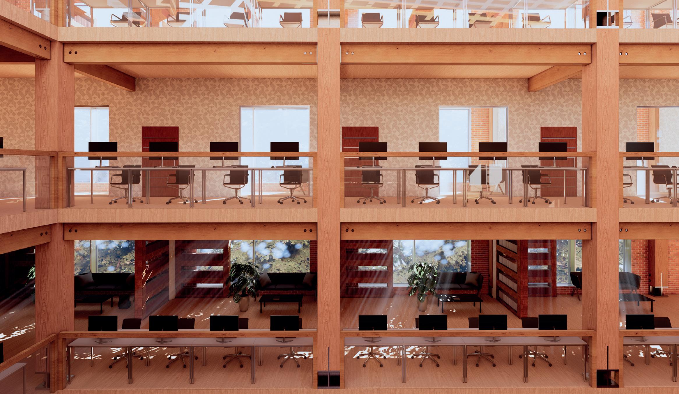 With that research I created 3 visuals of an interior space within my building and showed the different material options and their impact on the design as well as their impact on the structure.