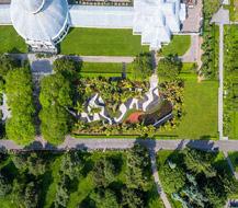 in the modernist garden, patterned pathways, reminiscent of the walkways at copacabana beach, lead visitors through rectilinear planting beds towards an open plaza. here, a large pool is framed by sculptural water feature: a wall carved in relief that recalls a burle marx installation in the banco safra headquarters in são paulo.