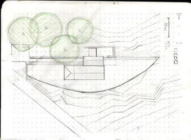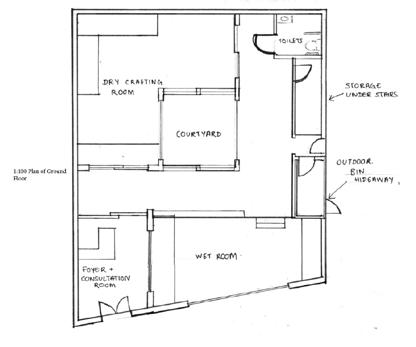 Initial plans focused on entry via Kempston street. the amjority of the studios would be on the ground floor while the black box studios are found in the basement. As the site has a 2m slope North to South (indicated by the red line), The initial plans centered itself in utilising this slope in order to reduce the energy required to excavate as well as reduce the costs of purchasing Top-soil. Essentially, the scheme tried to embed the building within the topography of the site.