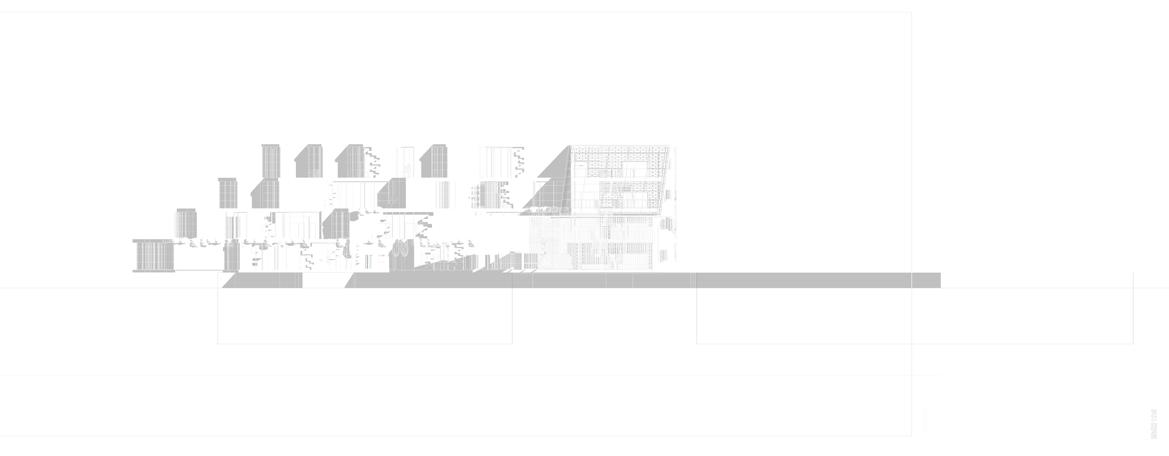 An open mezzanine was introduced as well as more floors to accomodate the daylight studio. As there was no focal point in the previous schemes, A large staircase wrapping a n elevator was positioned in a way that it would be one of the first things to reveal itself to those who enter. The basement was placed closer to the center of the public park, I the forced me to focus on the MaterPlan and how well the scheme would suite and complement it.