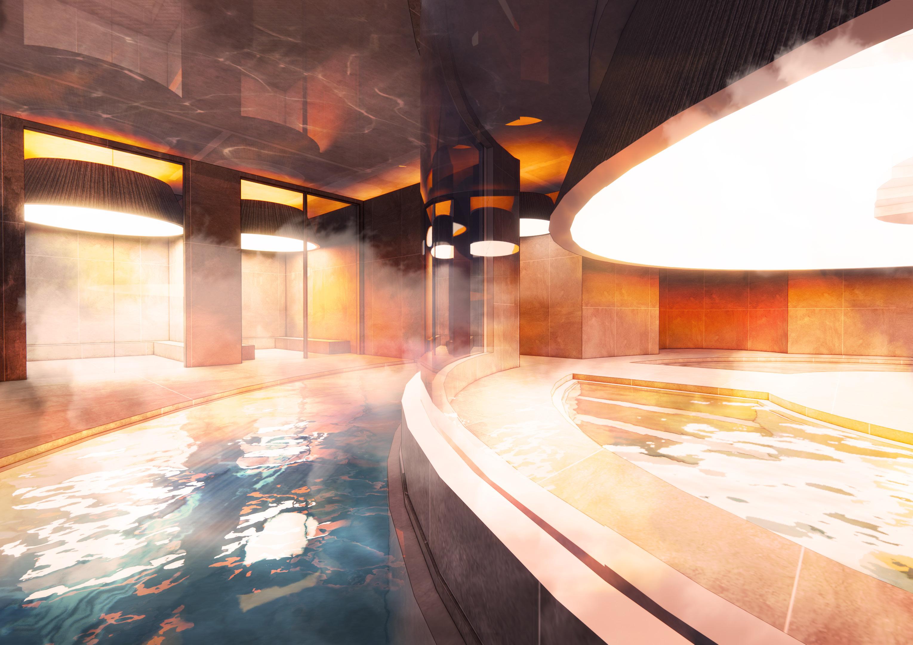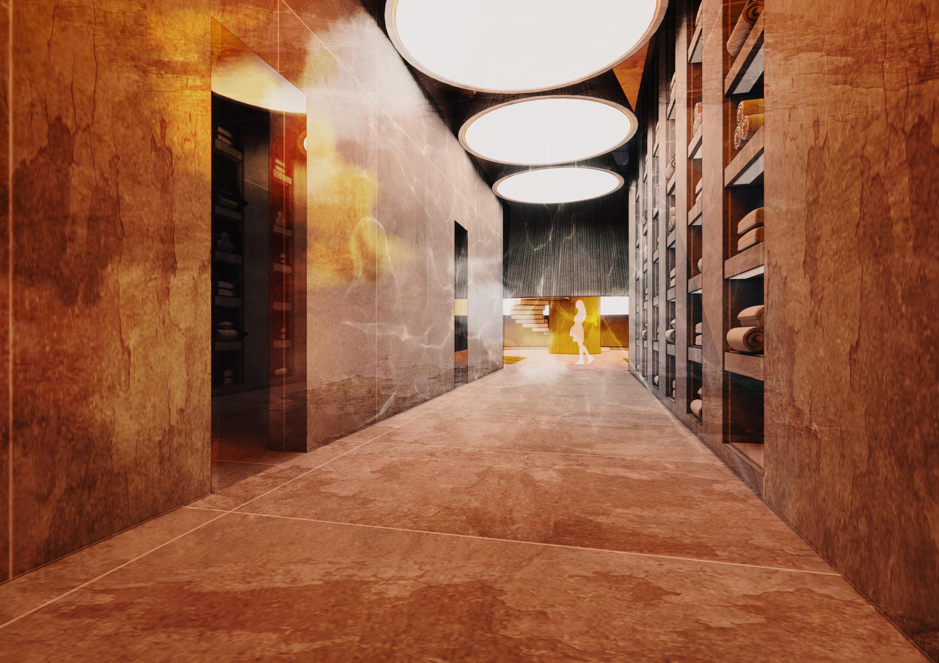 The basement level is located at the bottom of the central staircase and is intentionally designed to be dark, with the only natural light filtering down from the floors above. This level includes male and female changing rooms, a large pool that surrounds the bottom of the staircase, and two massage rooms. Additionally, there is a salt room, steam room, and sauna, allowing guests to relax and unwind after a long day.
