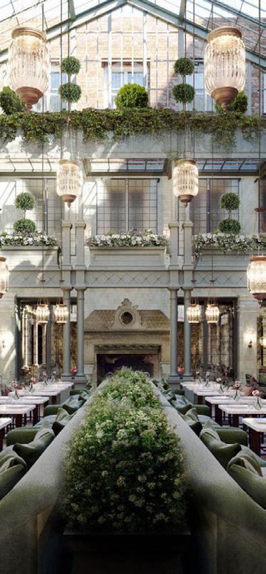 The first floor is where the atrium is located, featuring abundant natural light and greenery. This floor includes a bar area and a large restaurant that stretches across the entire level and is situated directly underneath the atrium light.