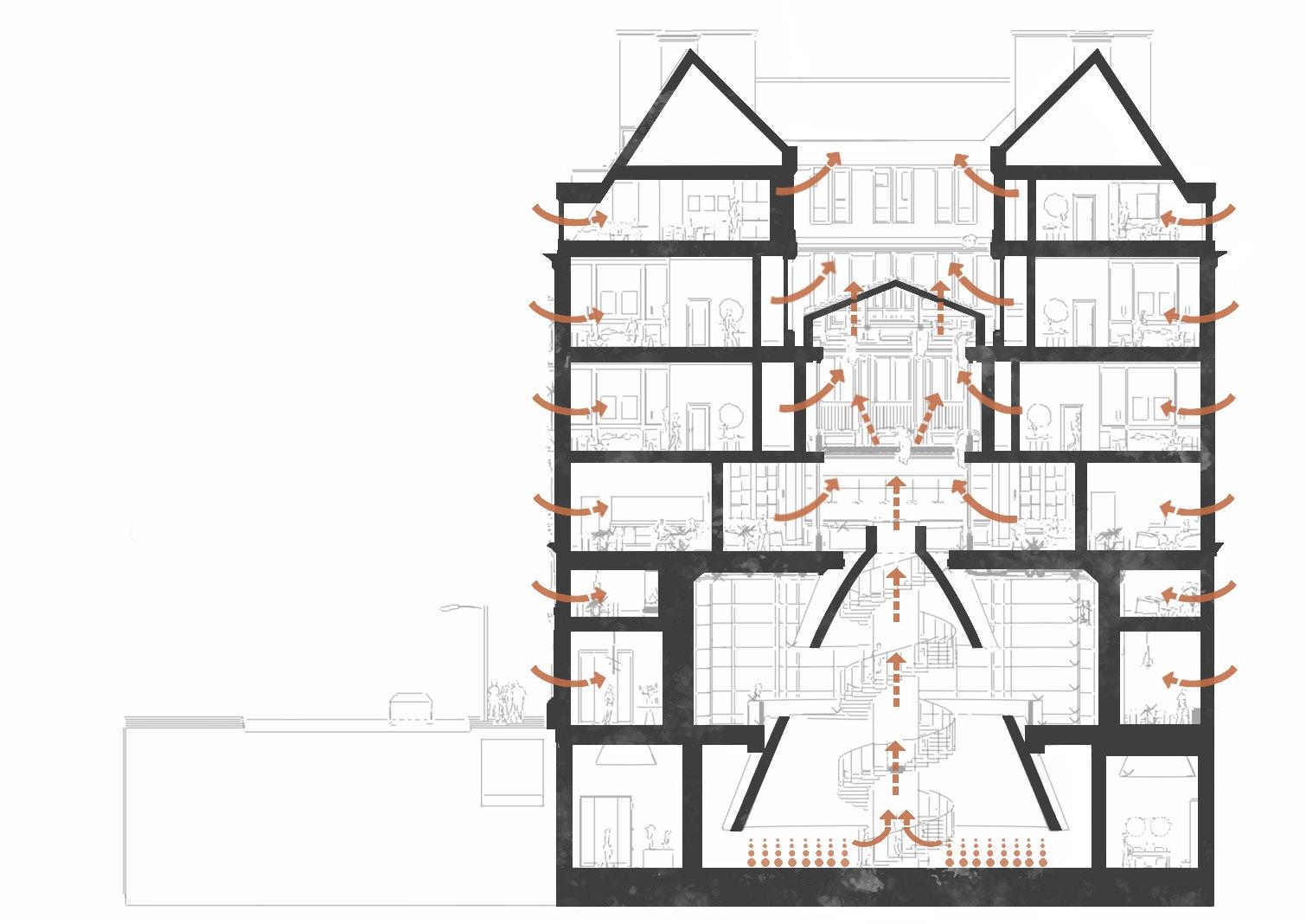 The stack ventilation system uses buoyancy to move air and create air movement. In the hotel design, it draws air up through the central staircase from the basement spa and out through the central atrium. The warm air from the spa rises through the staircase creating negative pressure that draws in cool air from outside. This cool air is pushed up through the staircase by the rising hot air, providing a continuous flow of fresh air throughout the hotel. The system provides a comfortable environment for guests, regulates temperature, reduces humidity, and removes unwanted odors or pollutants. Additionally, it is energy-efficient and promotes a healthy environment.