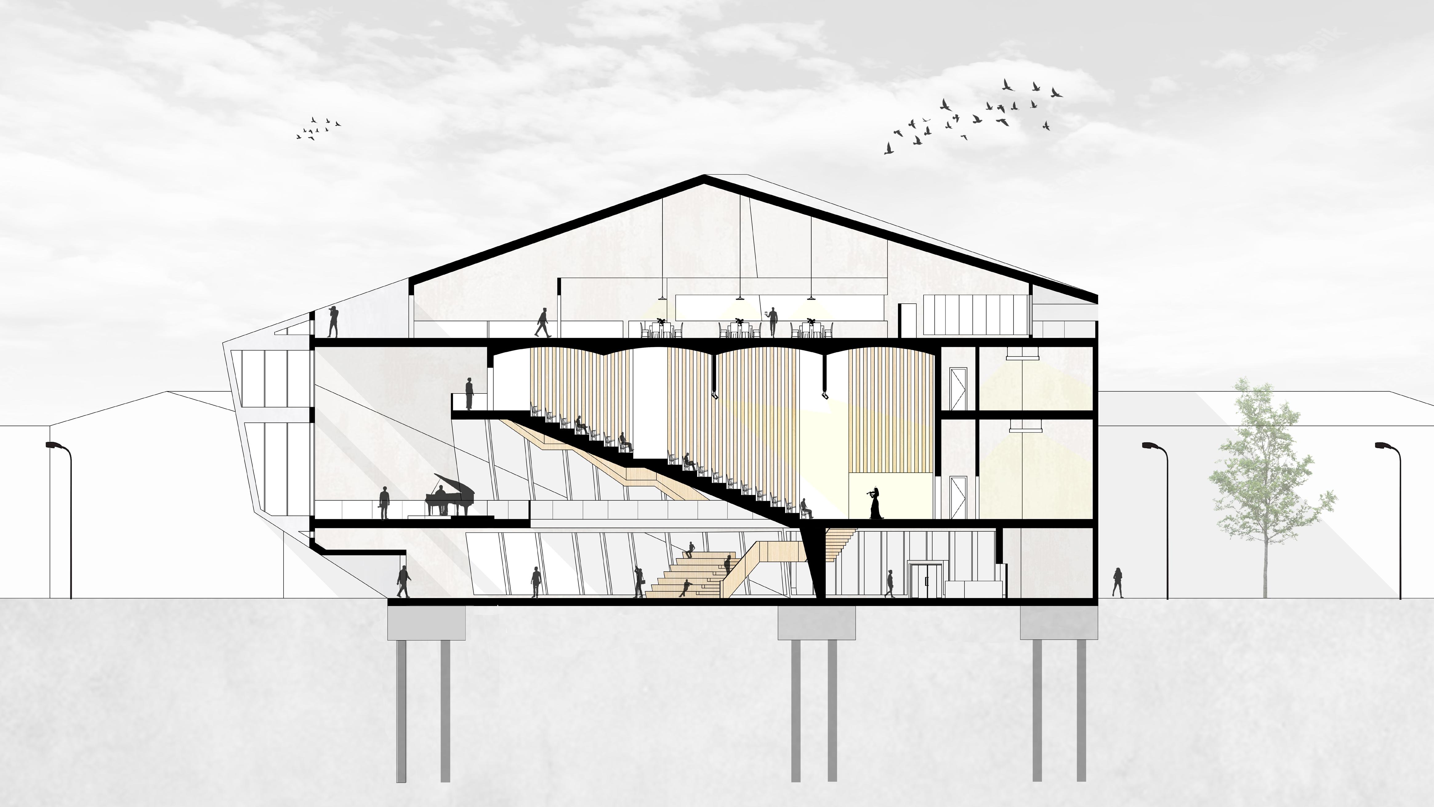 Jubilee House: The concept behind Jubilee House is to create a landmark within an emerging district, The Ten Streets. With the recent development of Everton Park Stadium, Jubilee House will become another iconic public venue, focused on cultural engagement within the area. Located along the main road of Great Howard Street, Jubilee House is set on an unused, derelict park that has been left unattended for decades.