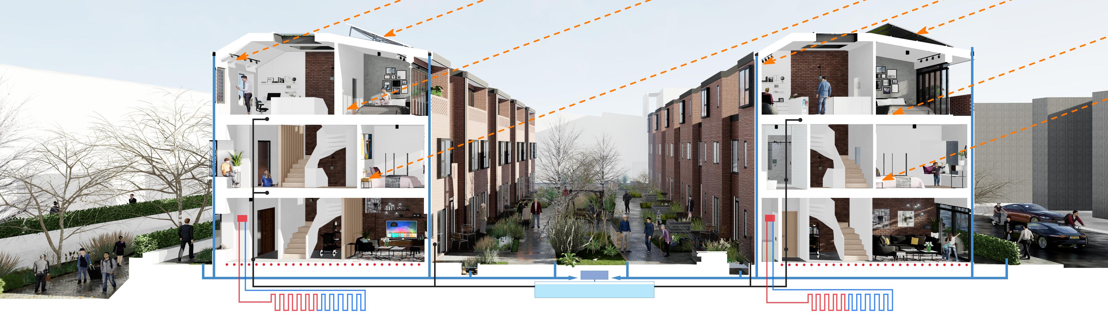 Voids to allow outdoor - indoor space while allowing light to pass through to the north units. Integration of communal space on the ground floor while outdoor living room introduced between units to allow private social interaction.