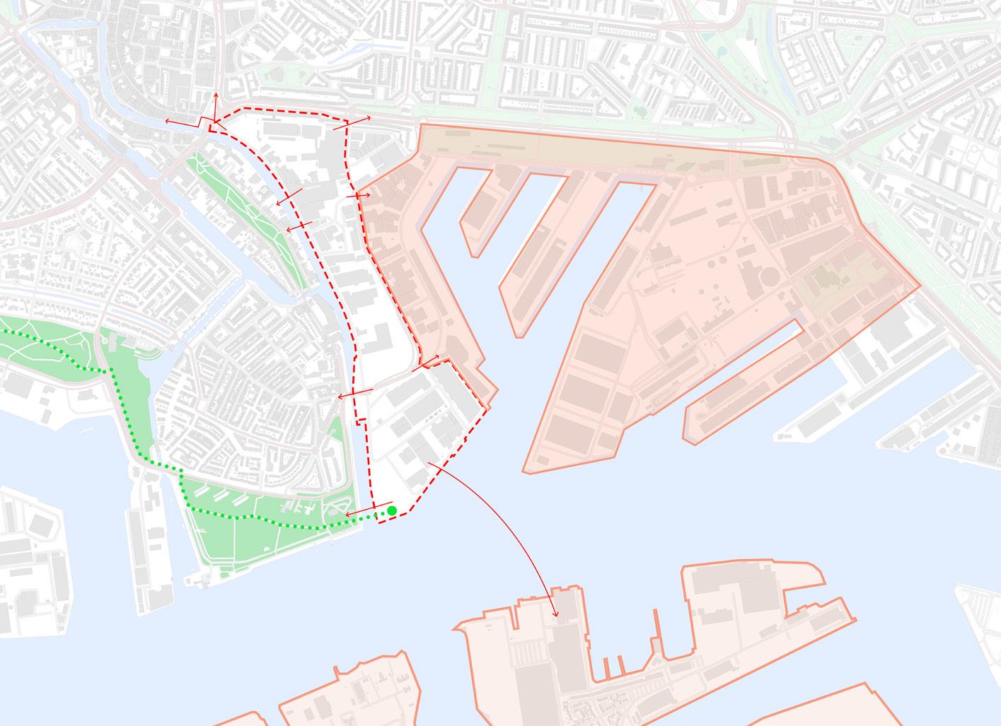 Located on the north end of the masterplan within the art and culture square. The existing mixed-use of residential and commercial along the main road provides an important context defining the boundary of the old town and the industrial area . The entrance to the peninsular on the canal side is the main route from the old town is almost quite hidden through a one-lane road between two commercial blocks adjacent to the existing public square on the north; separated by the busy main road. The narrow road is part of the connected series of squares which will open up to the new urban development and will be a part of the green route proposed in the urban masterplan The surrounding appearance of the site especially the south-facing elevation of the residential block is quite unappealing with all the abandoned cars and items along the walls. The adjacent warehouses on the east side that will be repurposed for workshops and a maker market not only strengthen the character of the square but also will provide a programme connected with the new development that focuses on creative social exchange . Although there are many businesses and manufacturers remained operating in the area, the main road for the vehicles will be through NieuwMathenesserstraat on the east side along the dike allowing the canal side road to be semi-pedestrianised for a more pedestrian and bike-friendly environment.