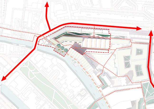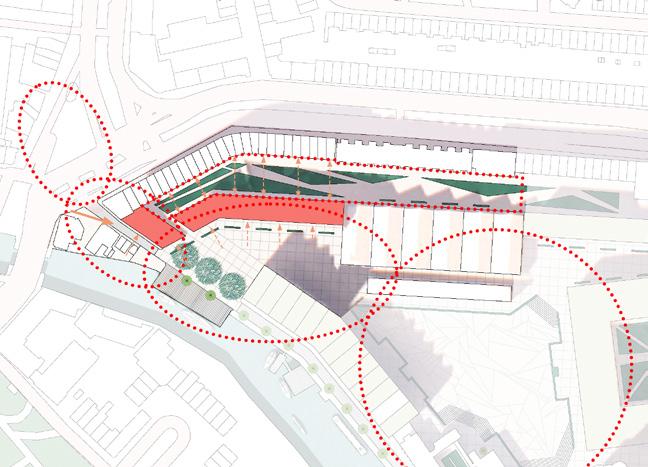 Co-working spaces and residential apartments with commercial units on ground level Art and craft square Events space Elevated platform for water taxi, social space and water activities Co-housing complex with mix public facilities and supporting services Introduction square Garden centre / Workshop New facade for the existing commercial units Mix-use block New arch entrance for the exisitng manufacturer Townhouses Footbridges across the canal Sunken theatre Outdoor events / festival space Cafe / Restaurant / Deli Bar Winter garden with residential units and rooftop on top Allotment area / Productive Area Open market area Pops-up stall Children playground Outdoor gym / Fitness facilities Waterfront area with social and eatery spaces Sport facilities Tram stops Elevated path through the emerging landscape Elevated walkway Viewing Platform - recycle and reuse steel structure Garden festival Events space Cafe / Bar Restaurant Restaurant (crane) Maker market Garden on ship Marshland Emerging Landscape 01 02 03 04 05 06 07 08 09 10 11 12 13 14 15 16 17 18 19 20 21 22 23 24 25 28 29 30 31 32 33 KEYS: RE-PURPOSE BUILDNGS / RE-CYCLE: Water taxi stop 26 M4H Manufacturing facilities 27 Residential + commercial ground level 34 EXISTING: Workshop Commercial units 35 Silo 36 Offices 37 deKuyper Royal Distrillers 38 Nolet Distillery 39 ODB Beverages (food manufacturer) 40 Rijnmond-Bouw (learning centre) 41 M.T.C Powder Coating 42 Thesis focus area N.T.S thesis project: Creative Social Exchange P03 P02 P01 Semi-pedestrian Pedestrian Main Road Accessibility Key connected public realm