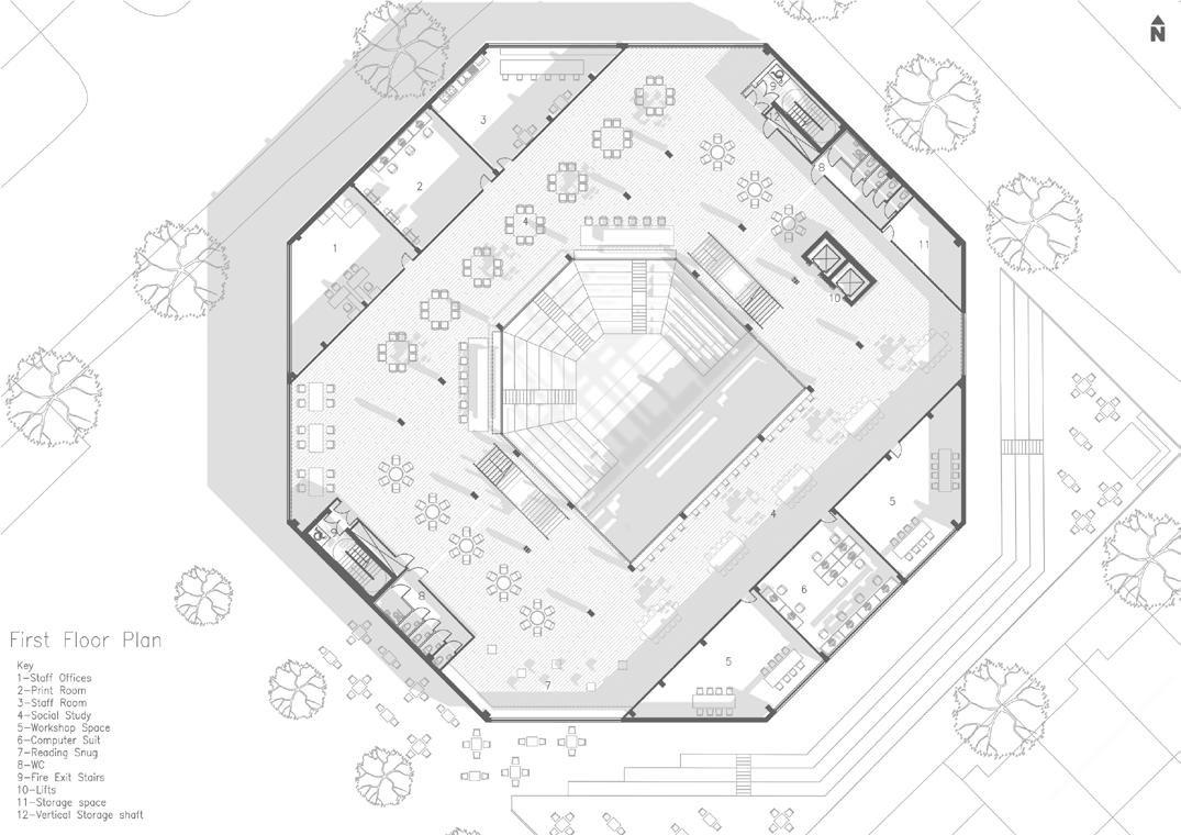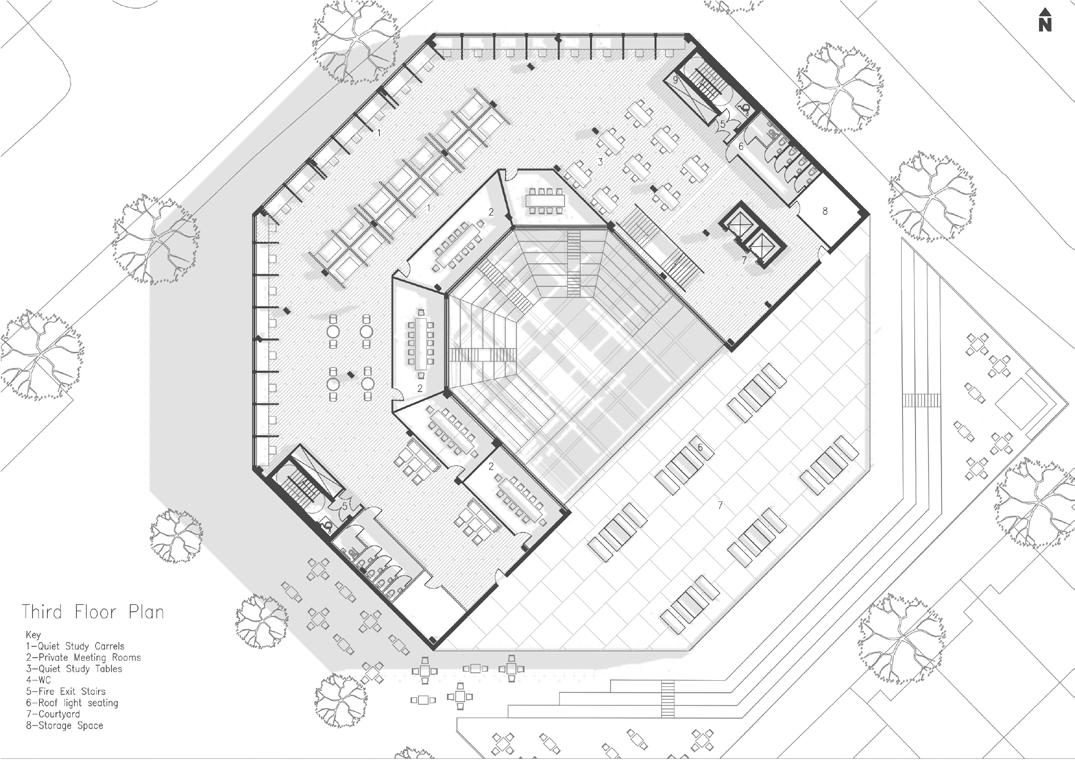 Some activities that take place in the library include, yoga classes, fitnes classes, social study, performance space, cafe, outdoor performance space.