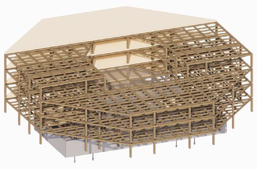 The structure is glulam beam frame with, CLT floors and a concrete block retaining wall