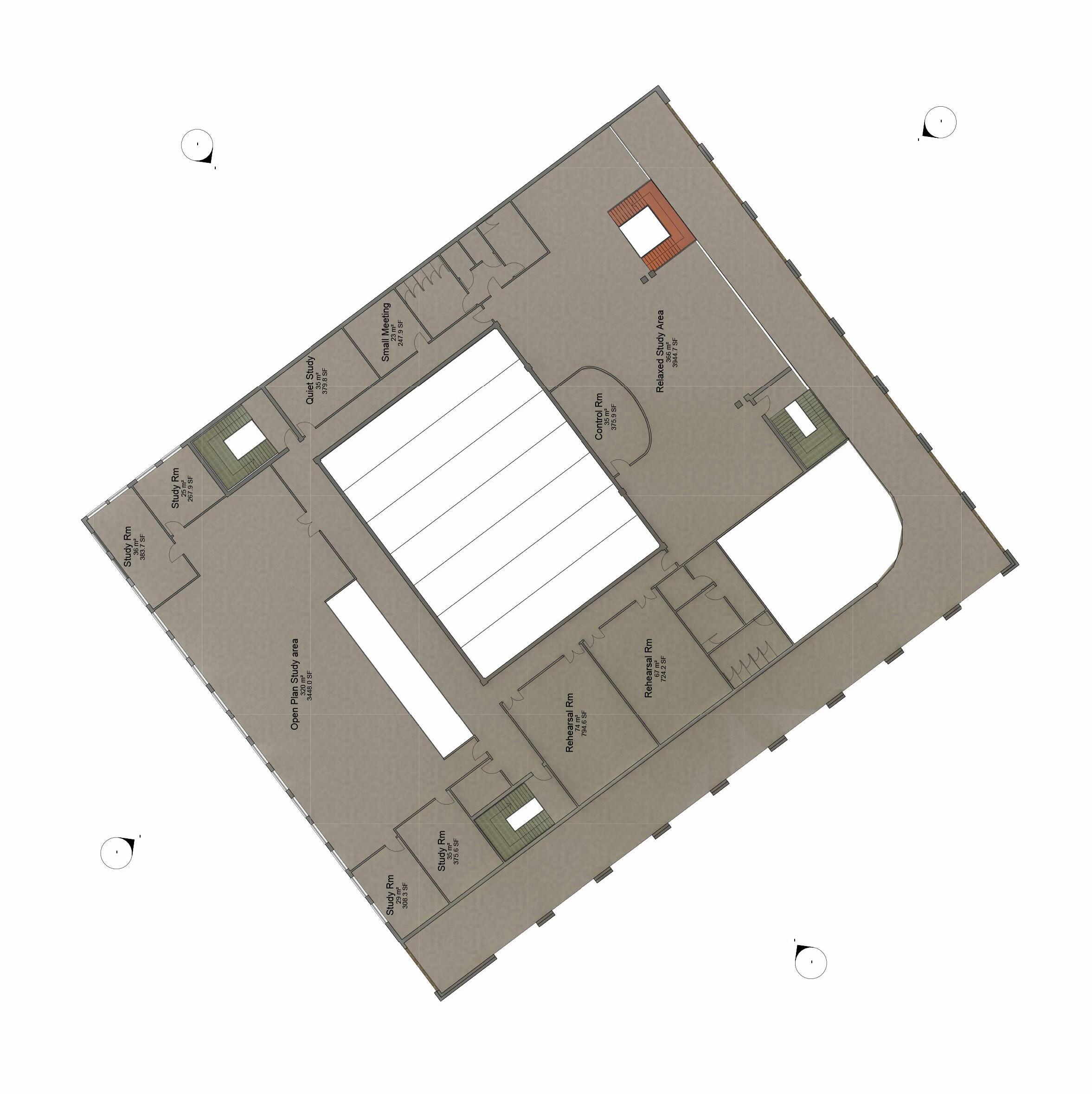 The first image is a structural axonometric drawing of the ground floor, this further shows the layout of the budiling and how there are a mixture of double height and regular sized rooms.