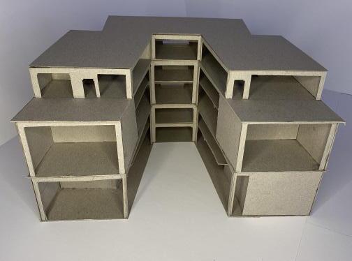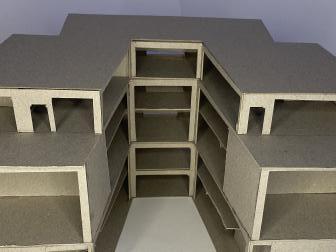 This is a 1:100 scale model made from grey card to represent the concrete that it is designed from.