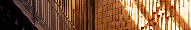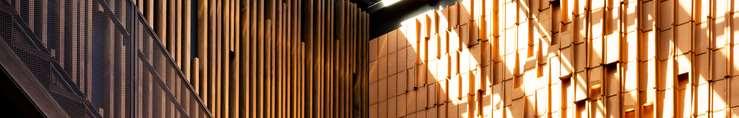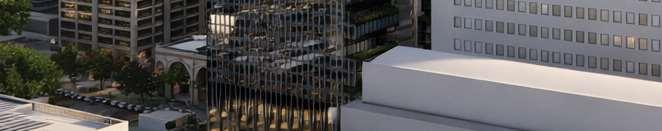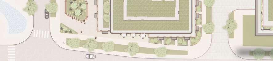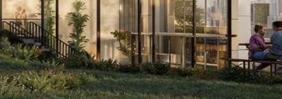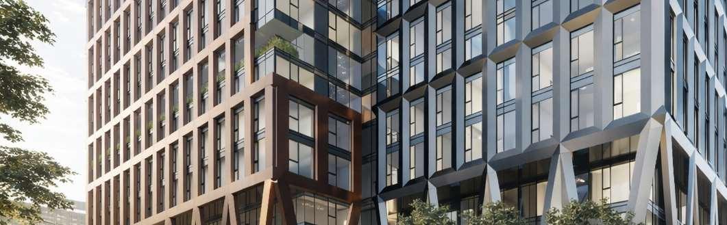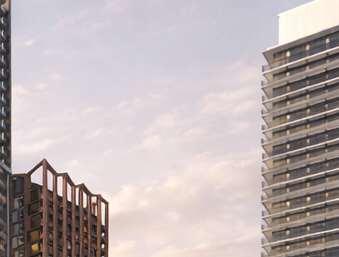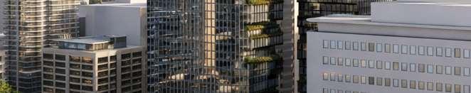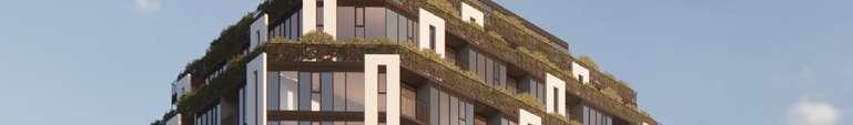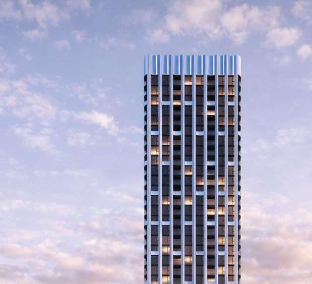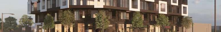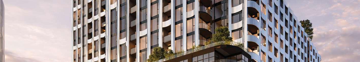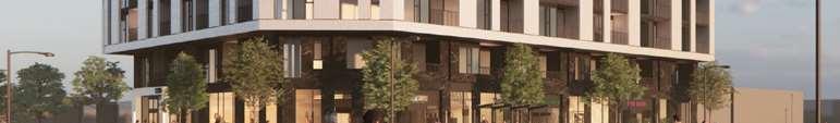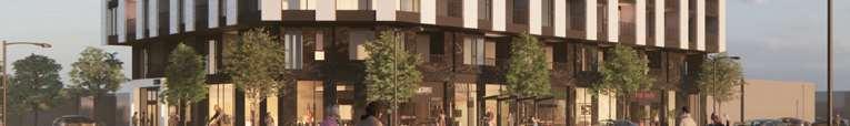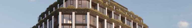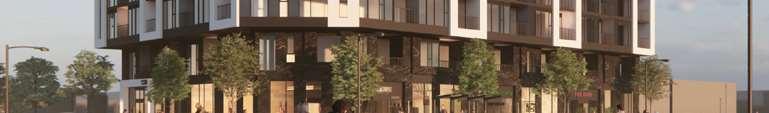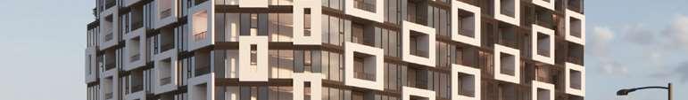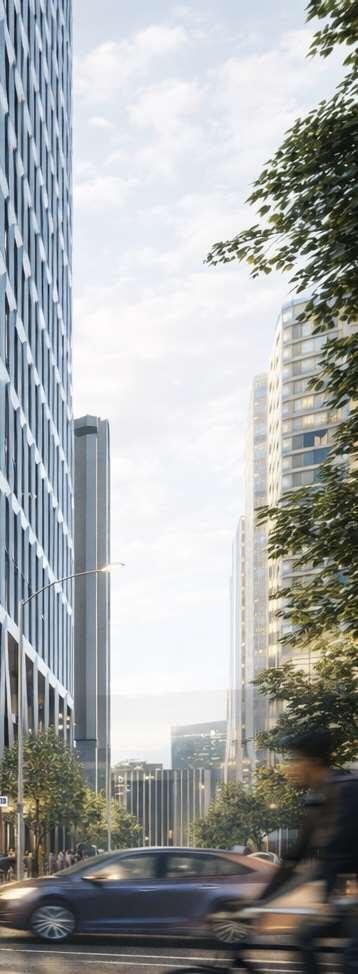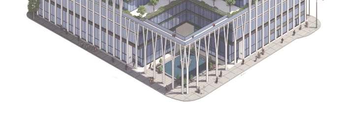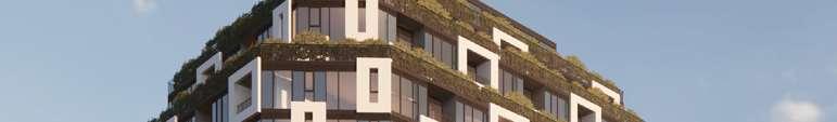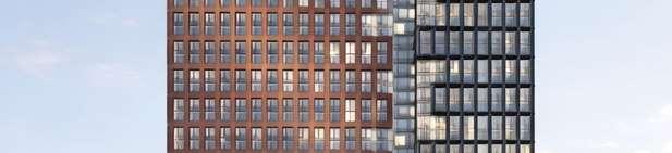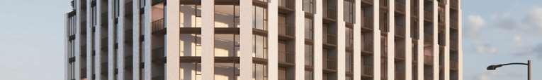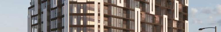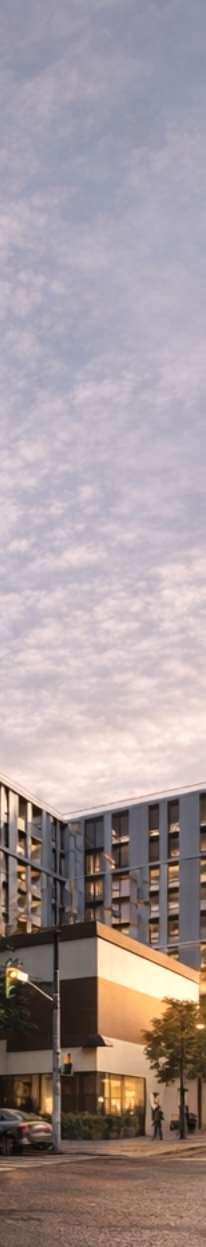 A terraced podium establishes a pedestrian-scaled frontage. The façade combines metal and precast panels, with the podium nished in warm-toned materials that add richness to the streetscape. Rounded internal podium corners soften the massing and enhance the ow of the outdoor spaces.