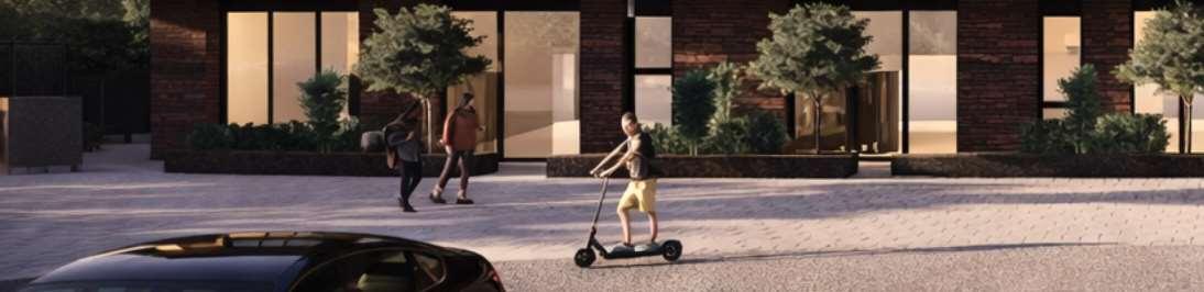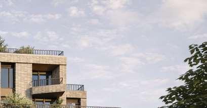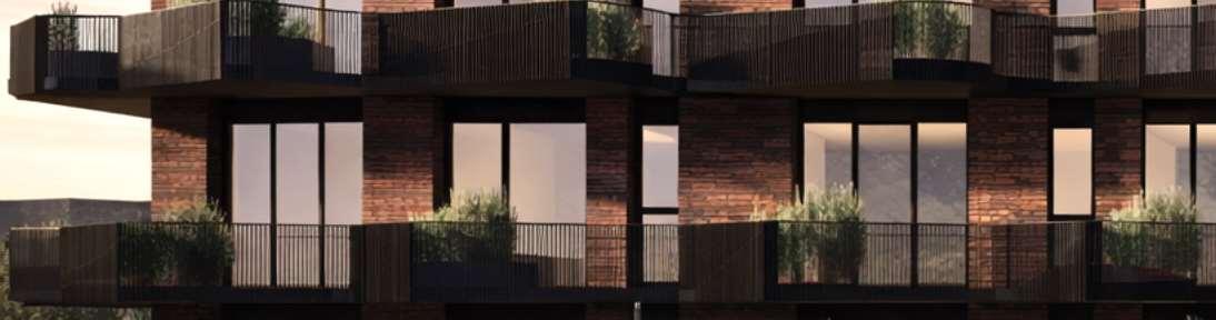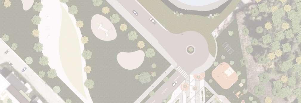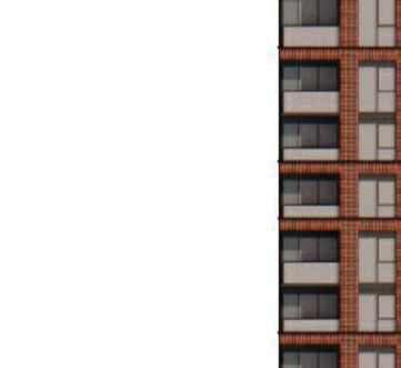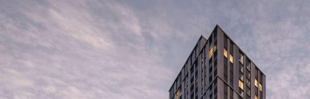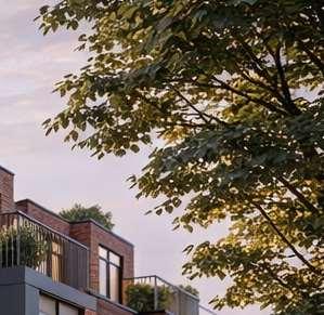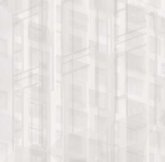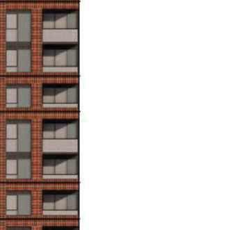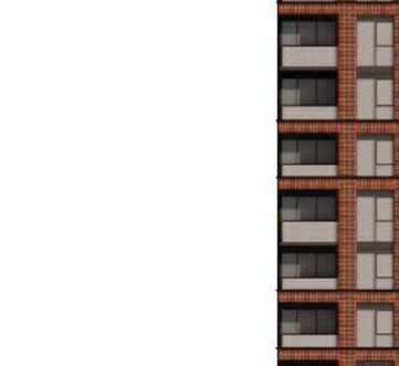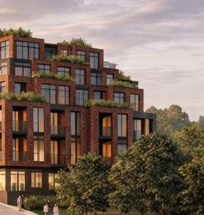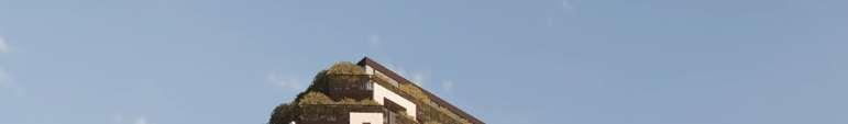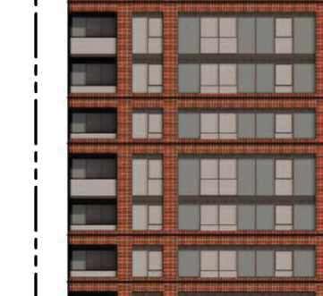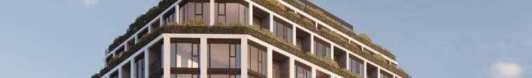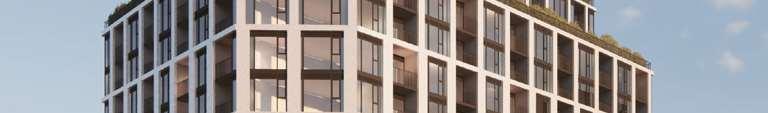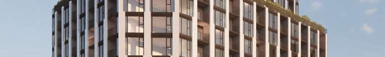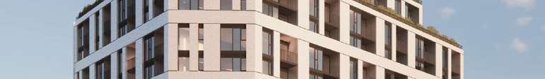 The 8-storey, 123-unit building is shaped by a modulated massing strategy that reduces perceived scale and responds to the site’s topography. Its architectural expression draws on the site’s natural character, using a re ned material palette that complements Bolton’s evolving urban fabric while maintaining a strong relationship to the southern landscape edge. A material transition at the corner visually divides the building into two masses, reducing its apparent bulk. An alternative scheme explored a more uid expression with continuous, undulating balconies.