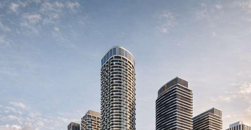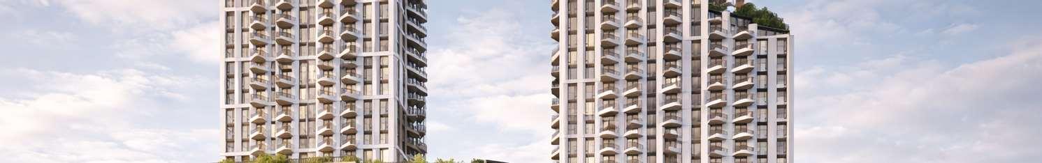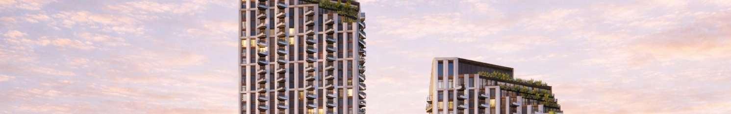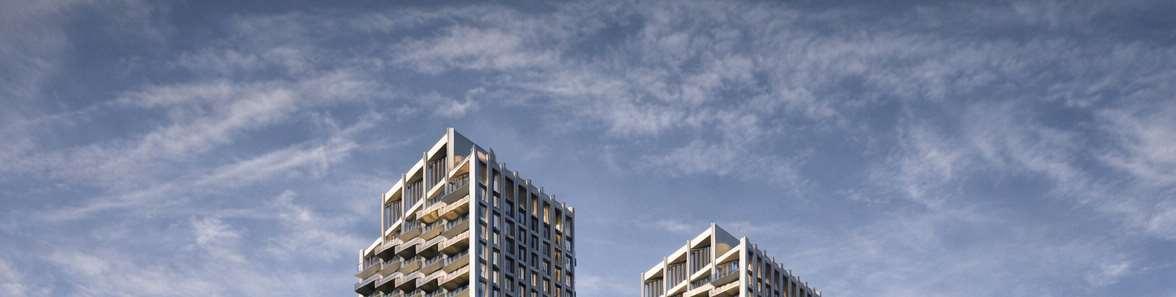 Located in Toronto’s Mount Dennis neighbourhood, the project comprises two towers, 34 and 24 storeys high, rising above an eight-storey podium and delivering 1,003 residential units ranging from studio to three-bedroom layouts. A portion of the site is dedicated to a new public park, contributing to the neighbourhood’s public realm.