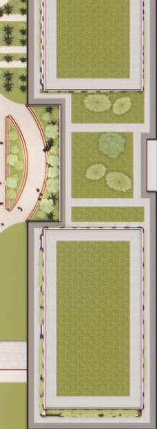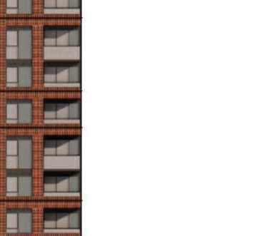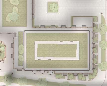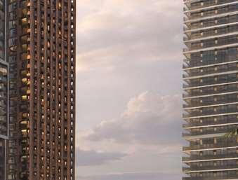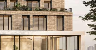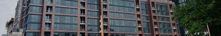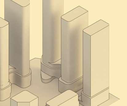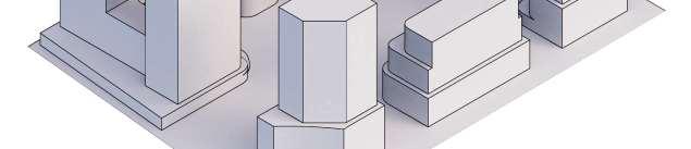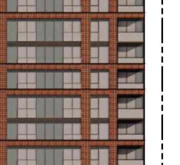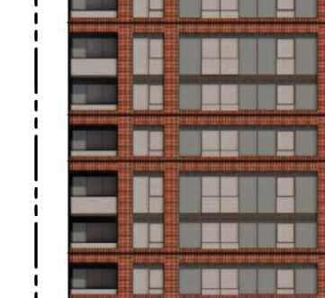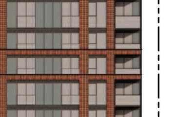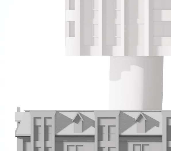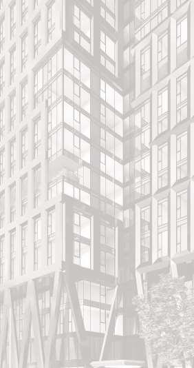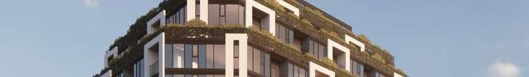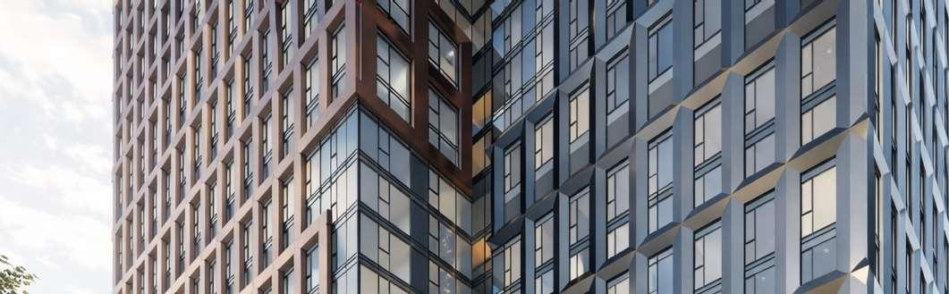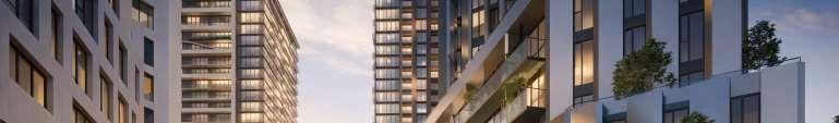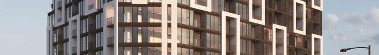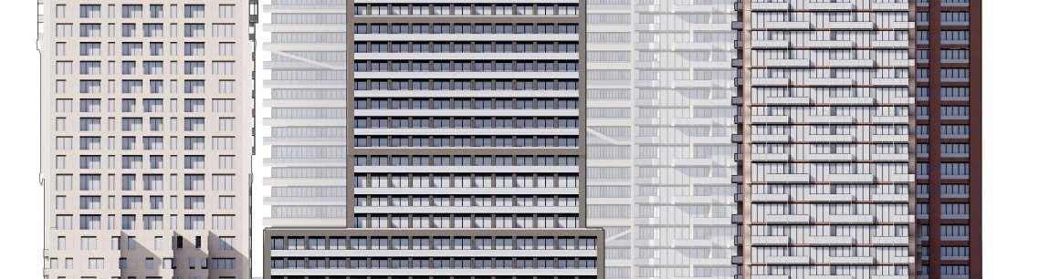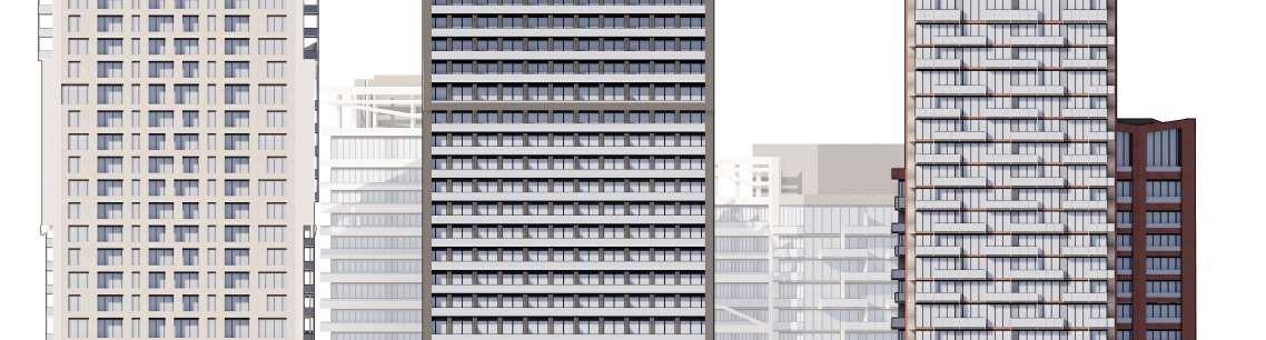 Located in front of the park, this block consists of an 8-storey podium topped by 34- and 37-storey towers, with a total of 856 units. Retail at grade brings activity to the ground oor. The façade design of both the podium and towers is inspired by the composition of the nearby Kent School’s facade, creating respectful dialogue with the historic context.