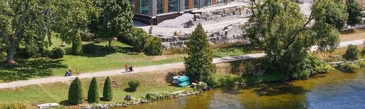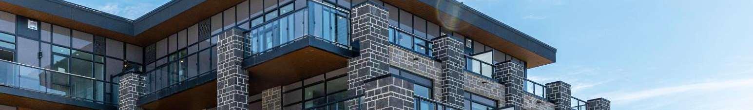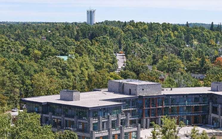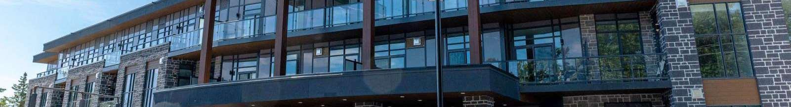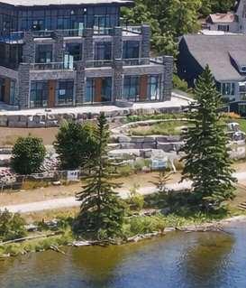 Situated at 99 Louisa Street in Fenelon Falls, the building is a three-storey, 57-unit condominium that integrates contemporary lodge architecture with prairie in uences and its lakeside setting. The project highlights materiality and form through a façade that pairs two tones of stone for depth and texture, wood-clad elements that add warmth and a resort character, and expansive glazing that enhances transparency and views.