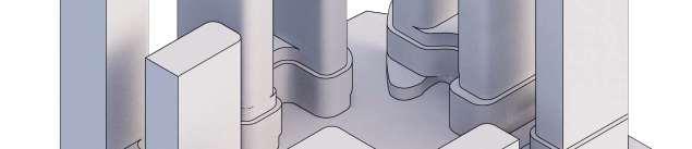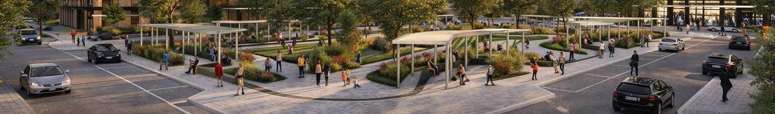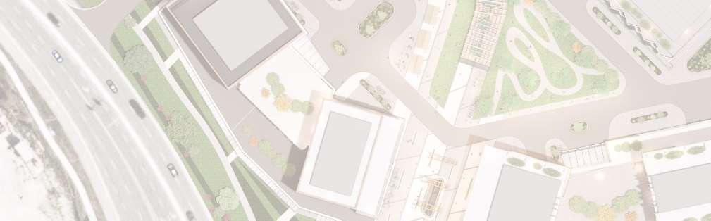 This proposal reimagines the existing Woodbridge Square shopping centre, located at the intersection of Weston Road and Highway 7, as a mixed-use community in downtown Vaughan. The project comprises nine towers ranging from 12 to 57 storeys, and delivers 4,388 residential units, ground-level retail, including a large grocery store. Starting from an extruded site block, the mass was strategically carved to shape the buildings while accommodating light, views, and streetscape connections. This process established a central open area - a privately owned public space (POPS) of over 3,700 m² - where curved forms introduce continuity and spatial ow, with building heights stepping down toward the south to optimize solar access.