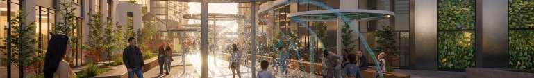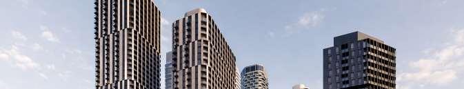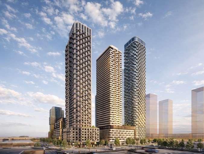 Located at the intersection of The Gore Road and Queen Street East, this masterplan envisions seven towers delivered across four phases, ranging from 23 to 43 storeys and connected by mid-rise podiums with ground- oor retail, of ce, and amenity spaces. Together, the development delivers 2,461 residences, including a mix of market units and 123 affordable-rate rentals, supported by three levels of underground parking, a central landscaped park with promenades, gardens, and an amenity building.