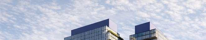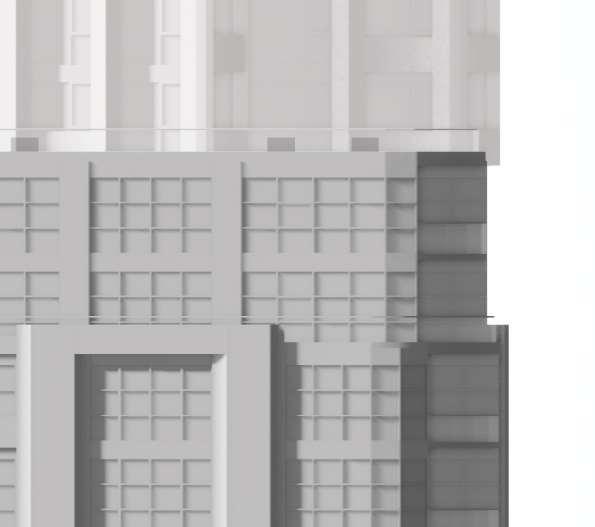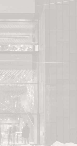 Originally conceived with white brick-inlay precast concrete cladding across the entire building, the material palette was later re ned to a medium grey tone for the tower to better relate to its context, and a darker grey at the base to reinforce the building’s visual anchoring. The ground oor corner was designed to enhance the pedestrian experience, with metal panels cladding articulating the galleria entrance and emphasizing its presence. On the 7th oor, a triple-height basketball court and double-height gym and sports lounge are articulated through a distinct metal cladding treatment, introducing additional variation to the façade.