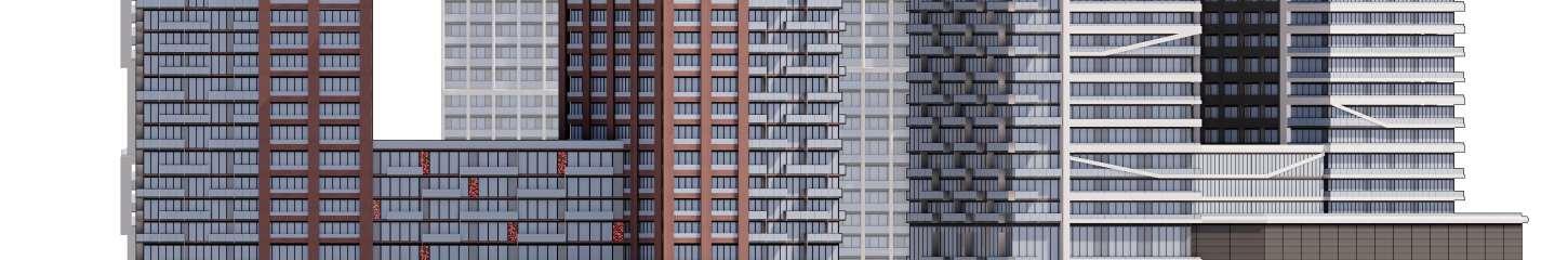 An initial submission proposed a higher datum line along The Queensway, resulting in a street wall perceived by the City as overly tall in relation to its context and at the pedestrian scale. The massing was subsequently revised to reduce the building’s bulk along the street. A contemporary palette of light-colored panels and glazing emphasizes vertical modulation. The nal façade design evolved through multiple iterations in close collaboration with the client. I led the design concept process, developing and advancing the architectural expression throughout these iterations.