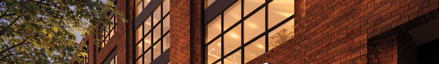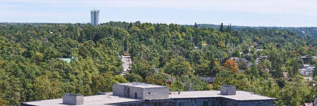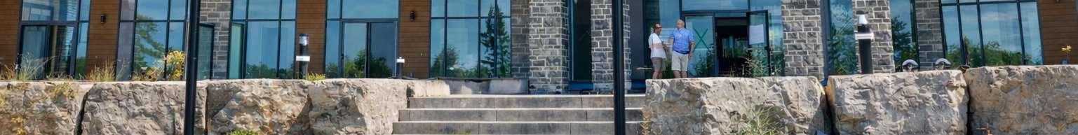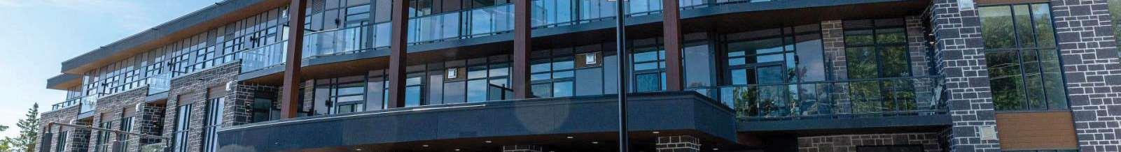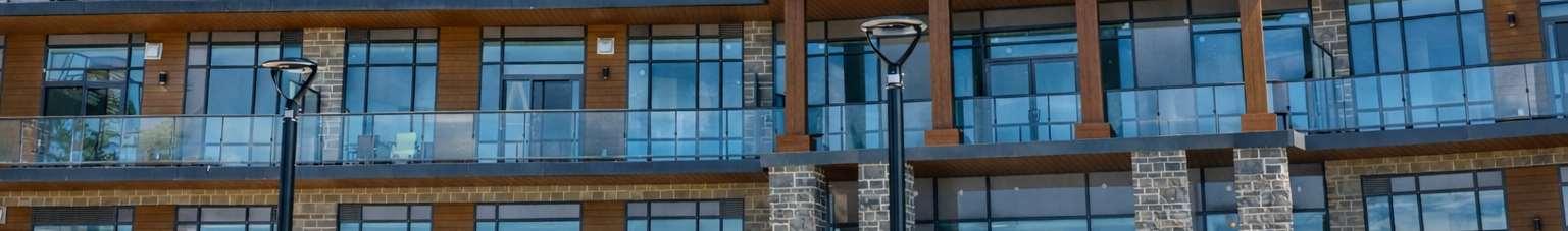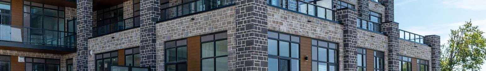 Situatedat99Louisa Street inFenelonFalls,thebuilding isathreestorey, 57-unit condominium that integrates contemporary lodge architecture with prairie influences and its lakeside setting. The project highlights materiality and form through a façade that pairs two tones of stone for depth and texture, wood-clad elements that add warmth and a resort character, and expansive glazing that enhances transparency and views.