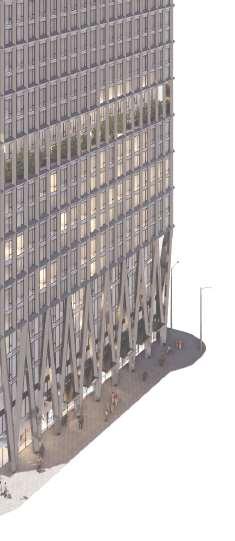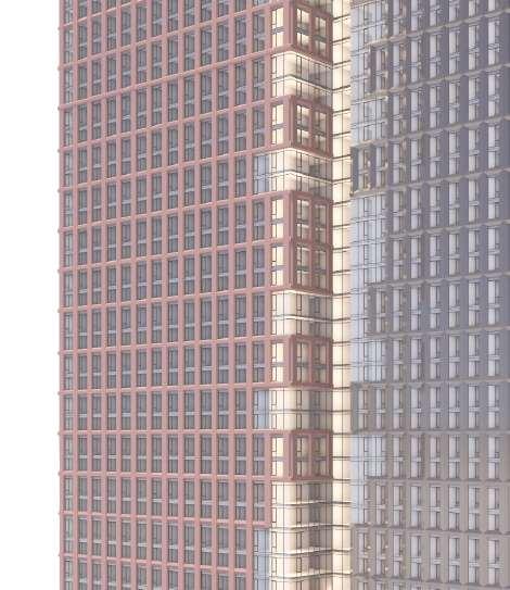 The design evolved to address these challenges through a revised massing strategy. The latest proposal consolidates the towers into a unified composition connected by an intermediate volume, reducing their heights to 59 and 53 storeys. The façade articulation recalls the original concept, maintaining the perception of two distinct volumes, with the connection being expressed through a glazed intermediate link. This iteration responds to regulatory constraints while improving spatial relationships
