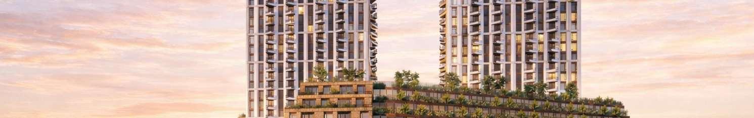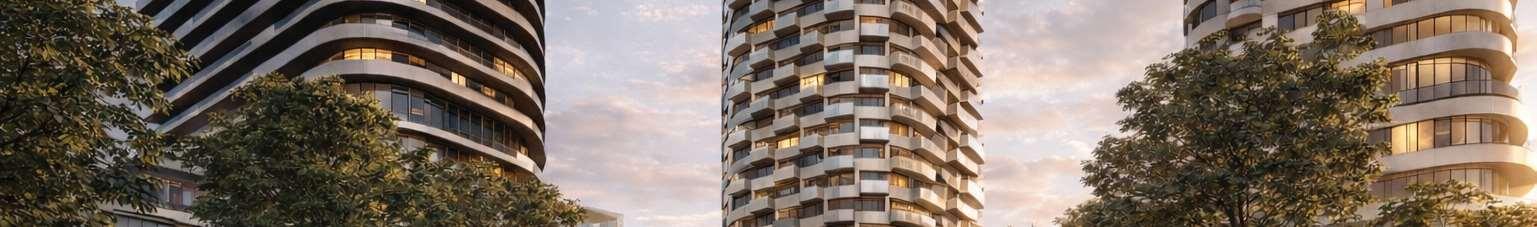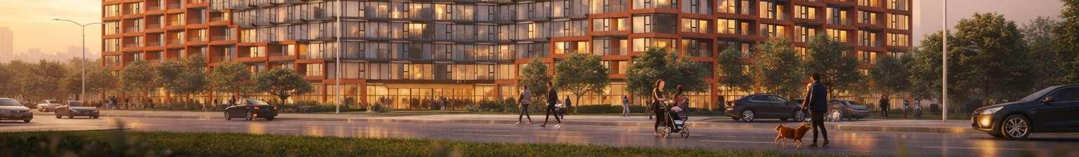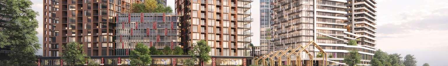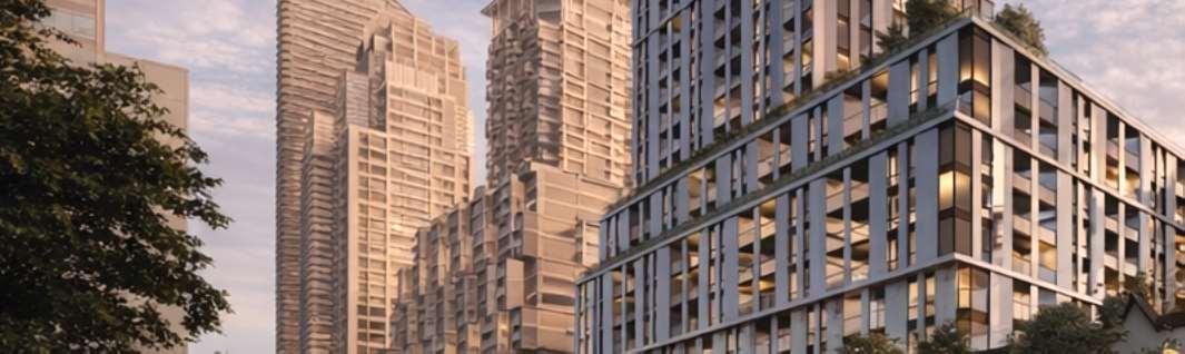Together, the development provides 2,461 residences, including a mix of market units and 123 affordable-rate rentals, supported by three levels of underground parking, a central landscaped park with promenades, gardens, and an amenity building.