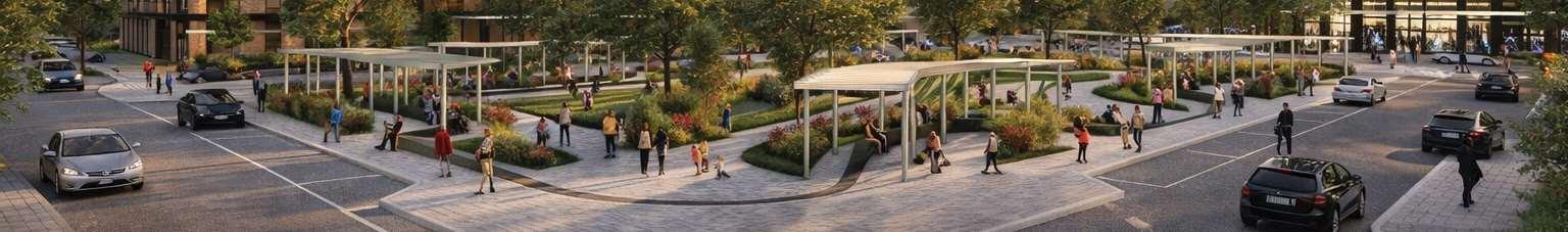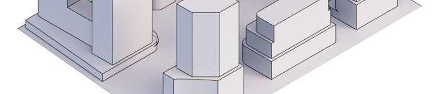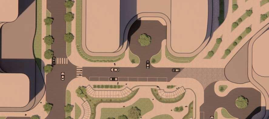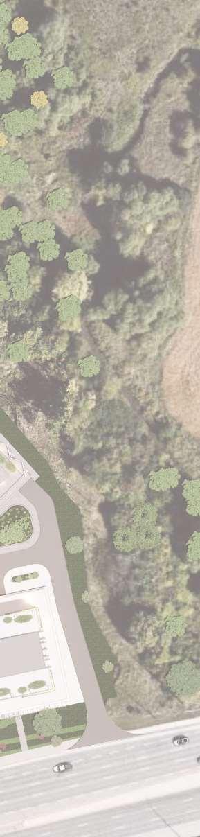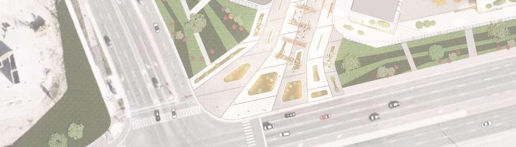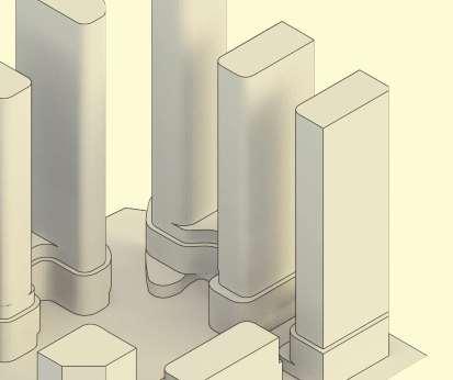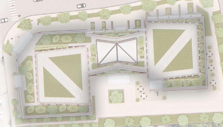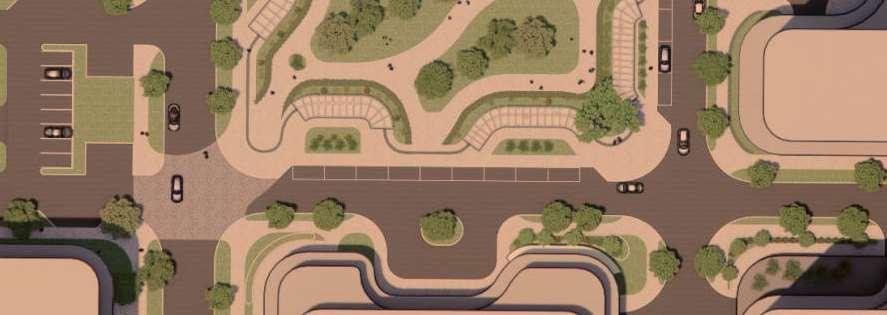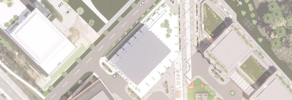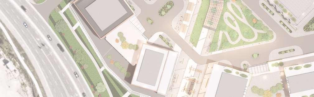 ThisproposalreimaginestheexistingWoodbridgeSquareshoppingcentre,located at the intersection of Weston Road and Highway 7, as a mixed-use community in downtown Vaughan. The project comprises nine towers ranging from 12 to 57 storeys, and delivers 4,388 residential units and ground-level retail, including a large grocery store. Starting from an extruded site block, the mass was strategically carved to shape the buildings while accommodating light, views, and streetscape connections. This process established a central open area — a privately owned public space (POPS) of over 3,700 m² — where curved forms introduce continuity and spatial flow,with buildingheightssteppingdowntoward the south to optimize solar access.
