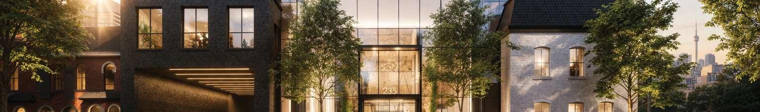 The Quinton is a 19-storey building situated along Dufferin Street that incorporates Kent School as a retained heritage element. The development includes 214 residential units, with ground-floor retail activating the public realm and strengthening connections to the park. Within the school, the ground floor is programmed as a community hub to support local initiatives, while the second and third floors are dedicated to office use.